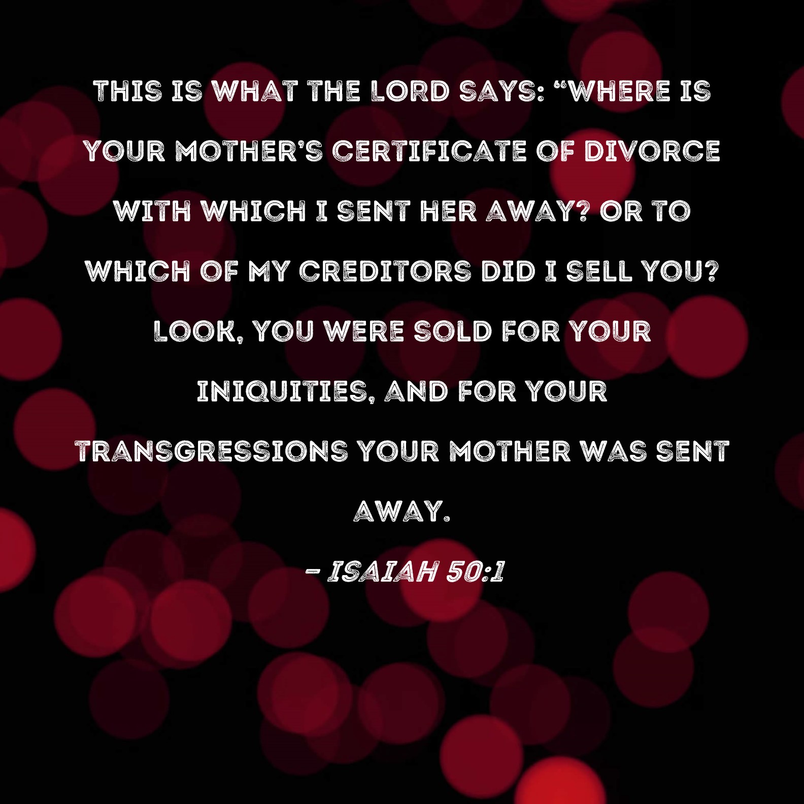 Isaiah 50:1 This is what the LORD says: "Where is your mother's certificate of divorce with which I sent her away? Or to which of My creditors did I sell you? Look, you were sold for your iniquities, and for your transgressions your mother was sent away.