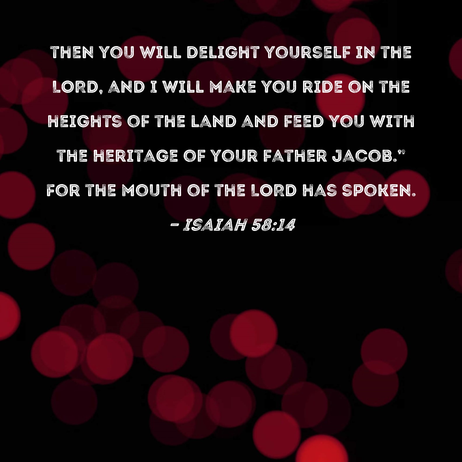 Isaiah 58:14 then you will delight yourself in the LORD, and I will make you ride on the heights of the land and feed you with the heritage of your father Jacob." For the mouth of the LORD has spoken.