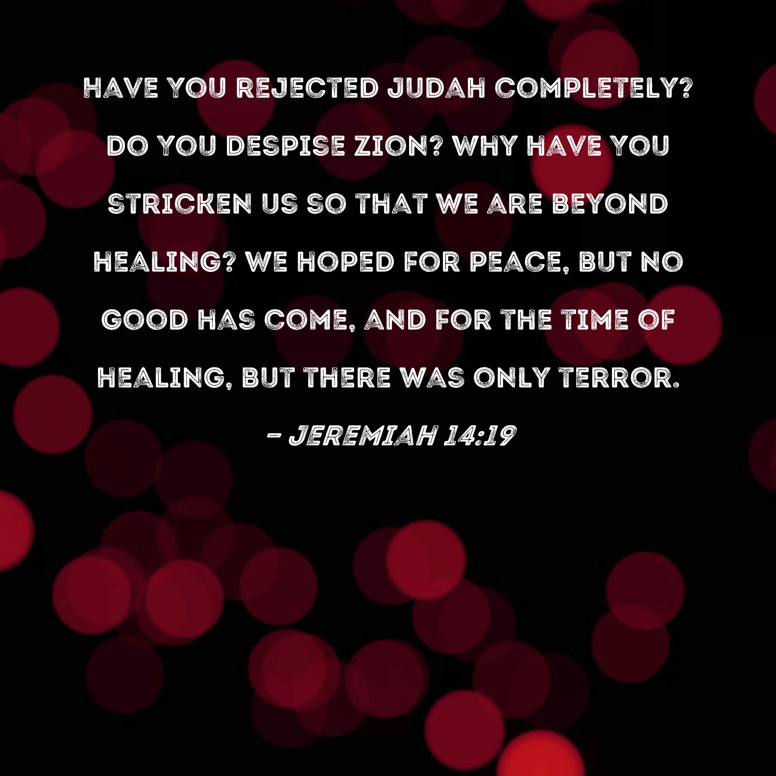 Jeremiah 14:19 Have You rejected Judah completely? Do You despise Zion? Why have You stricken us so that we are beyond healing? We hoped for peace, but no good has come, and for the time of healing, but there was only terror.