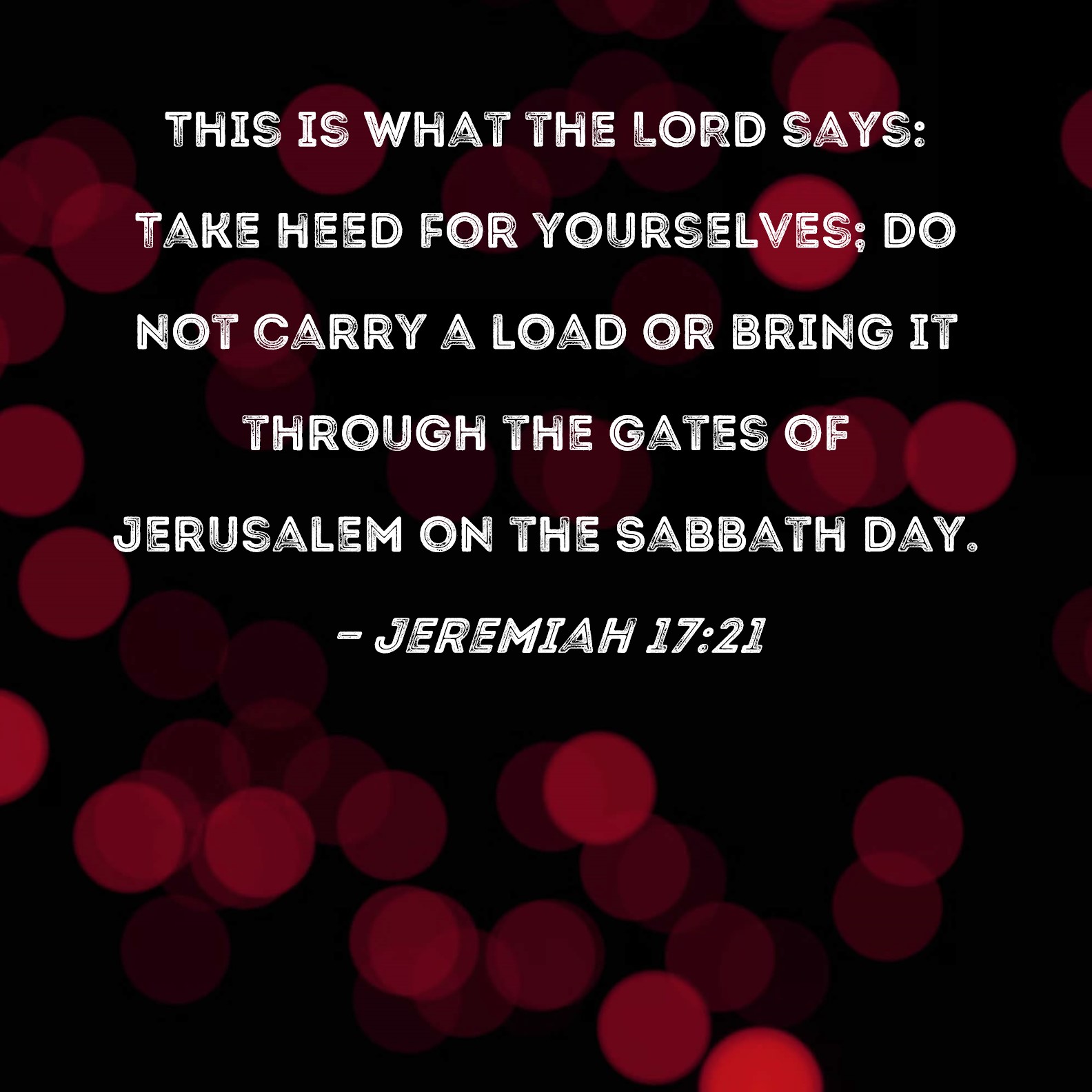 Jeremiah 17:21 This is what the LORD says: Take heed for yourselves; do not carry a load or bring it through the gates of Jerusalem on the Sabbath day.