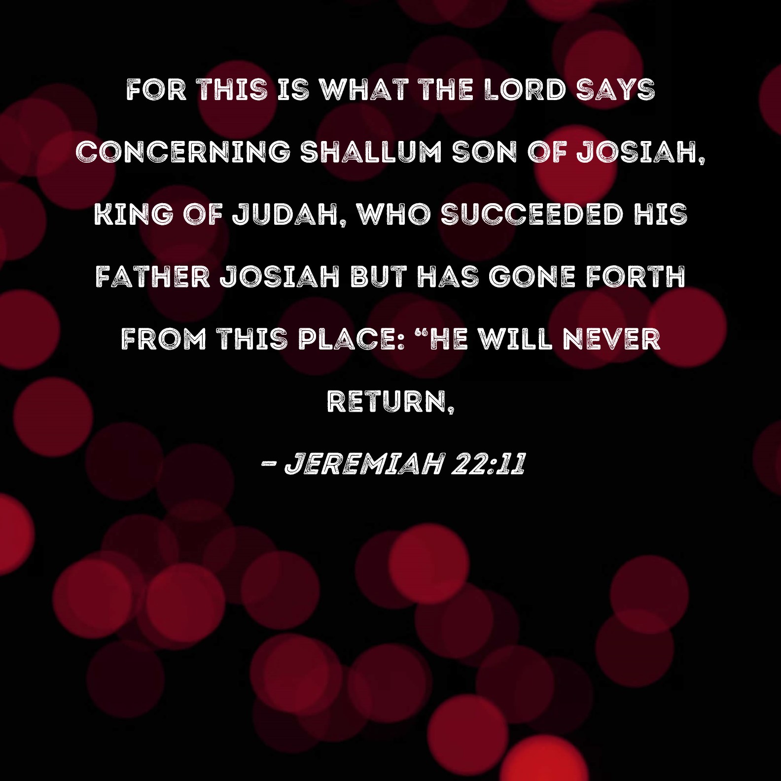 Jeremiah 22:11 For this is what the LORD says concerning Shallum son of Josiah, king of Judah, who succeeded his father Josiah but has gone forth from this place: "He will never return,
