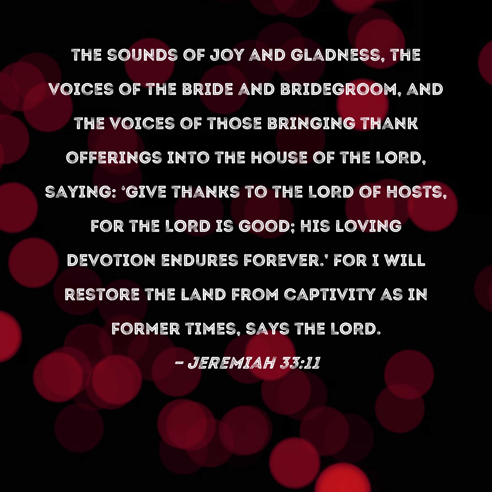 Jeremiah 33:11 the sounds of joy and gladness, the voices of the bride and bridegroom, and the voices of those bringing thank offerings into the house of the LORD, saying: 'Give thanks to the LORD of Hosts, for the LORD is good; His loving devotion endures forever.' For I will restore the land from captivity as in former times, says the LORD.