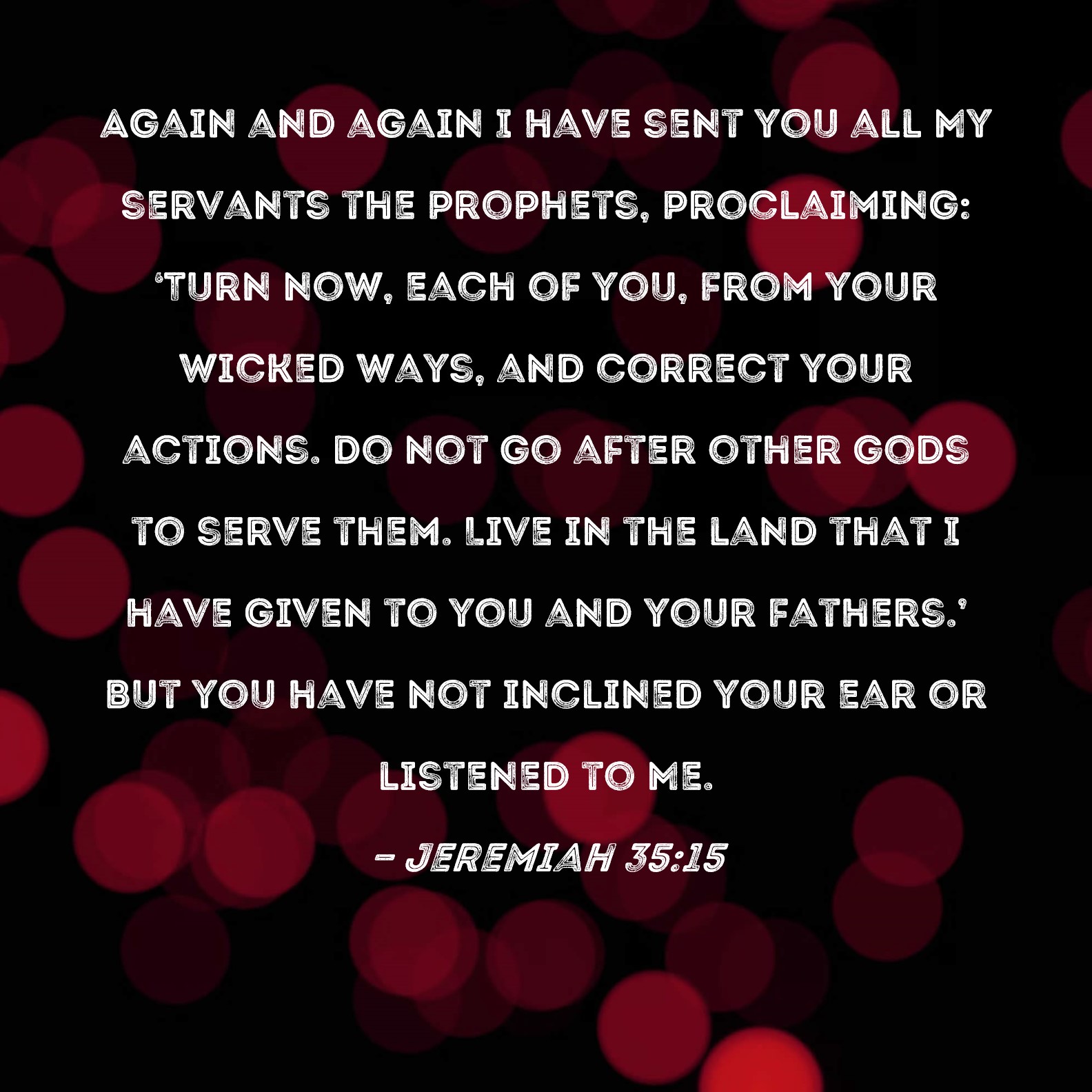Jeremiah 35:15 Again and again I have sent you all My servants the prophets, proclaiming: 'Turn now, each of you, from your wicked ways, and correct your actions. Do not go after other gods to serve them. Live in the land that I have given to you and your fathers.' But you have not inclined your ear or listened to Me.