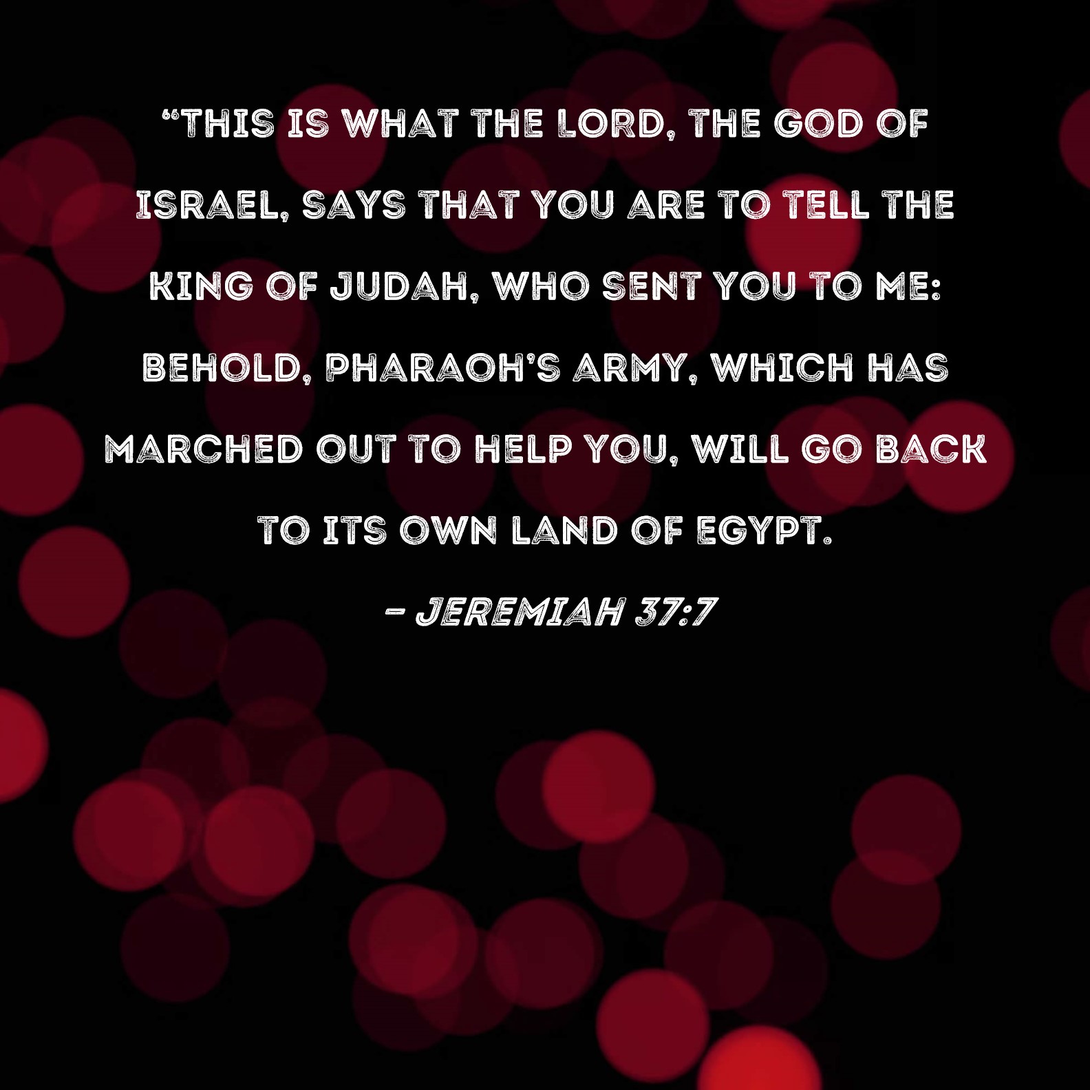 Jeremiah 37:7 "This is what the LORD, the God of Israel, says that you are to tell the king of Judah, who sent you to Me: Behold, Pharaoh's army, which has marched out to help you, will go back to its own land of Egypt.