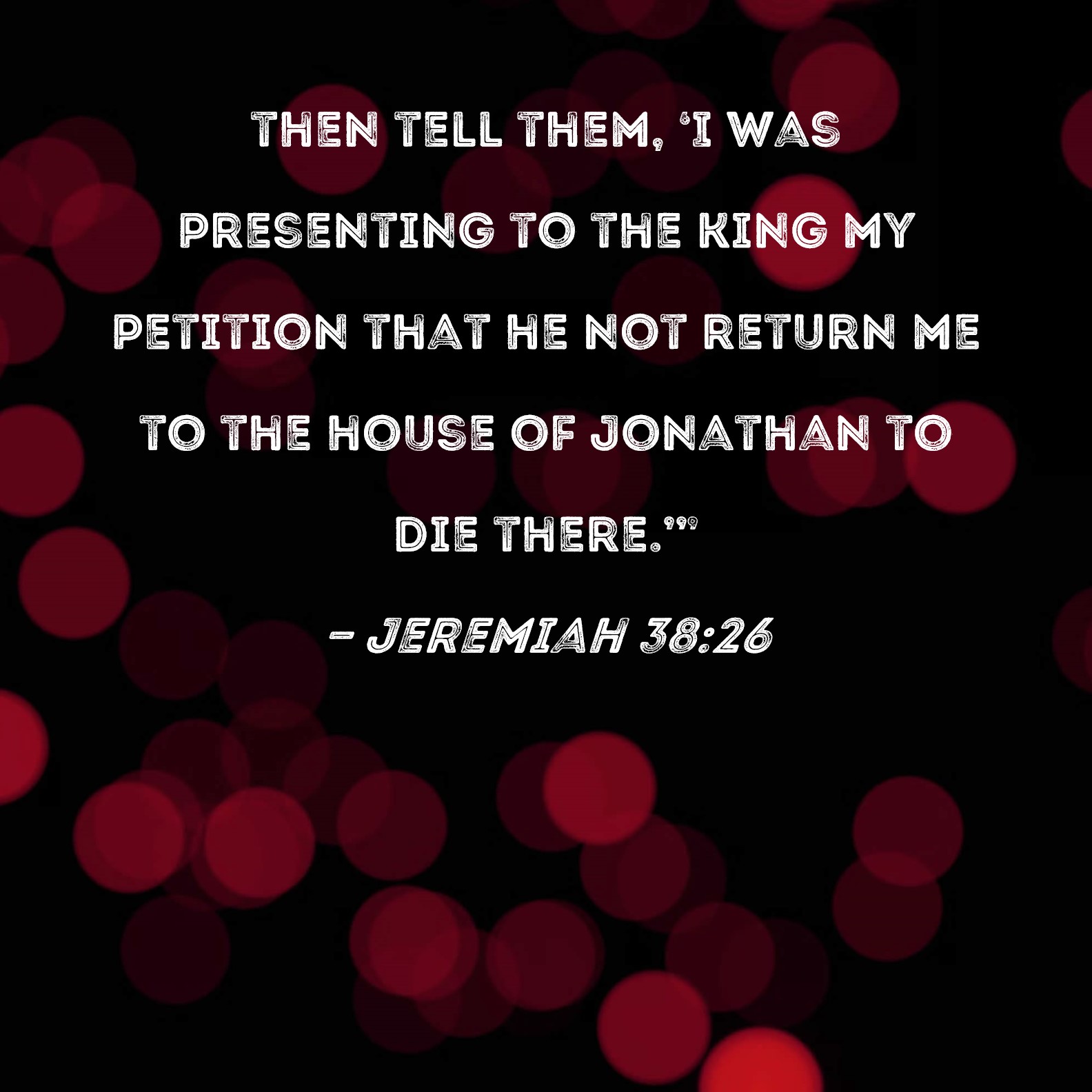 Jeremiah 38:26 then tell them, 'I was presenting to the king my petition that he not return me to the house of Jonathan to die there.'"