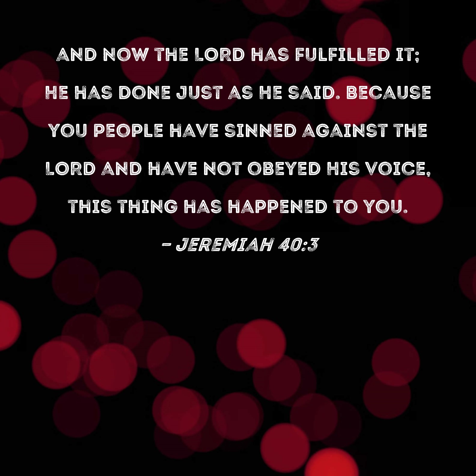 Jeremiah 40:3 and now the LORD has fulfilled it; He has done just as He said. Because you people have sinned against the LORD and have not obeyed His voice, this thing has happened to you.