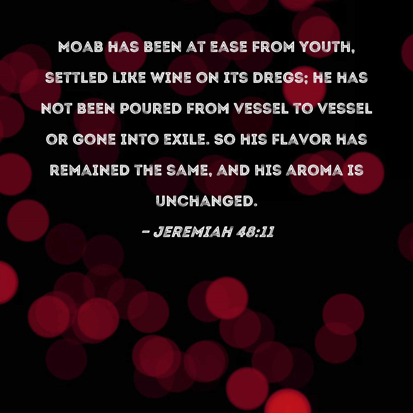 Jeremiah 48:11 Moab has been at ease from youth, settled like wine on its dregs; he has not been poured from vessel to vessel or gone into exile. So his flavor has remained the same, and his aroma is unchanged.