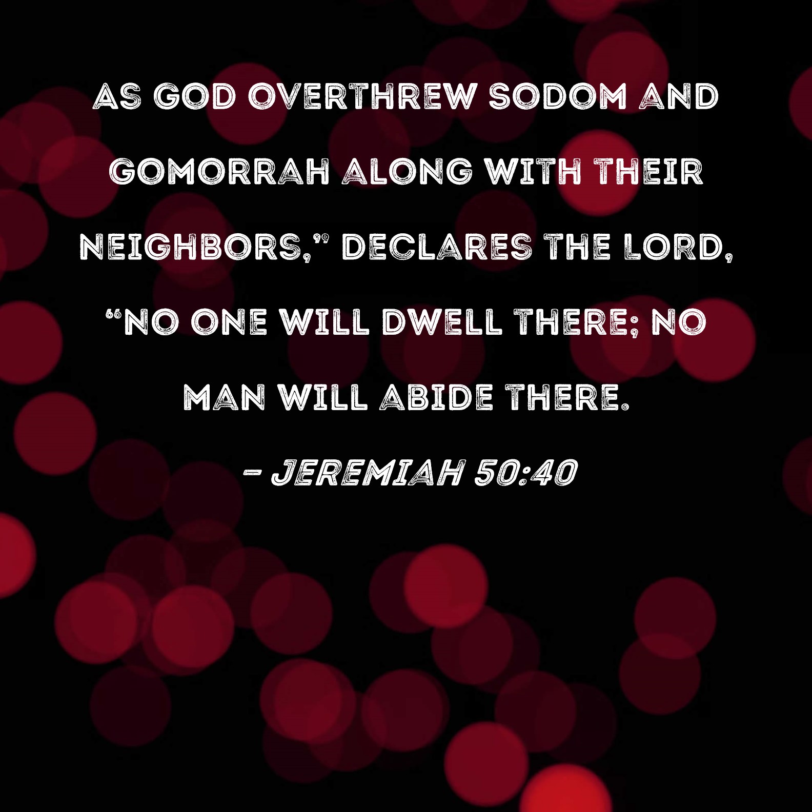 Jeremiah 50:40 As God overthrew Sodom and Gomorrah along with their neighbors," declares the LORD, "no one will dwell there; no man will abide there.