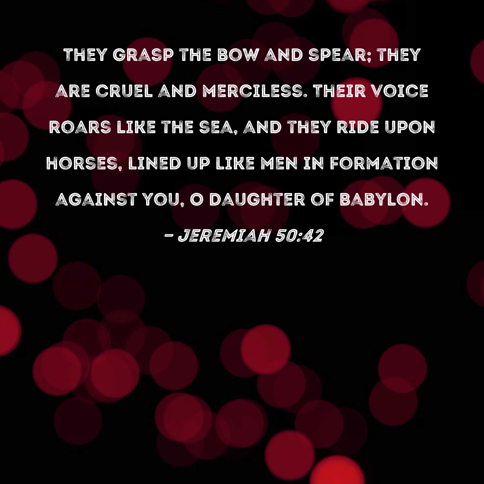 Jeremiah 50:42 They grasp the bow and spear; they are cruel and merciless. Their voice roars like the sea, and they ride upon horses, lined up like men in formation against you, O Daughter of Babylon.