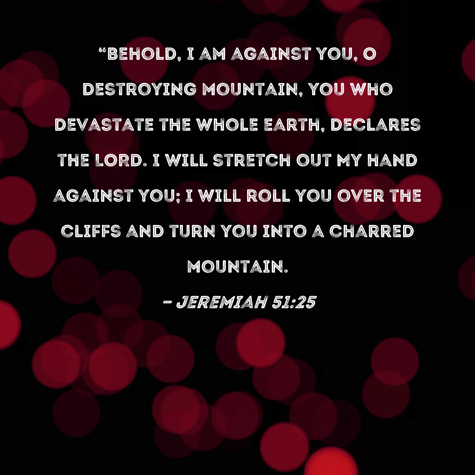 Jeremiah 51:25 "Behold, I am against you, O destroying mountain, you who devastate the whole earth, declares the LORD. I will stretch out My hand against you; I will roll you over the cliffs and turn you into a charred mountain.