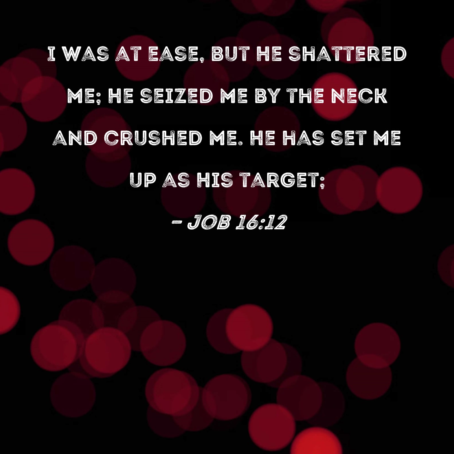 Job 16:12 I was at ease, but He shattered me; He seized me by the neck and crushed me. He has set me up as His target;