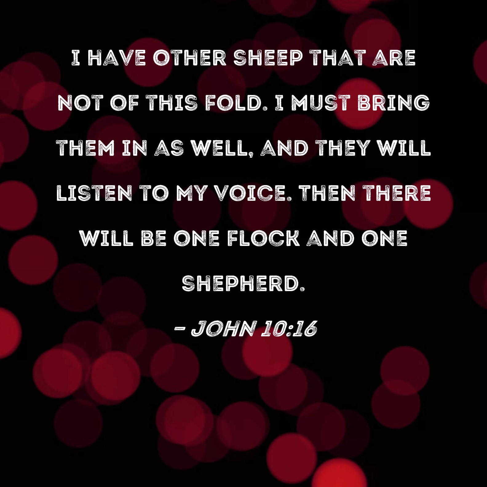 John 10:16 I have other sheep that are not of this fold. I must bring them in as well, and they will listen to My voice. Then there will be one flock and one shepherd.