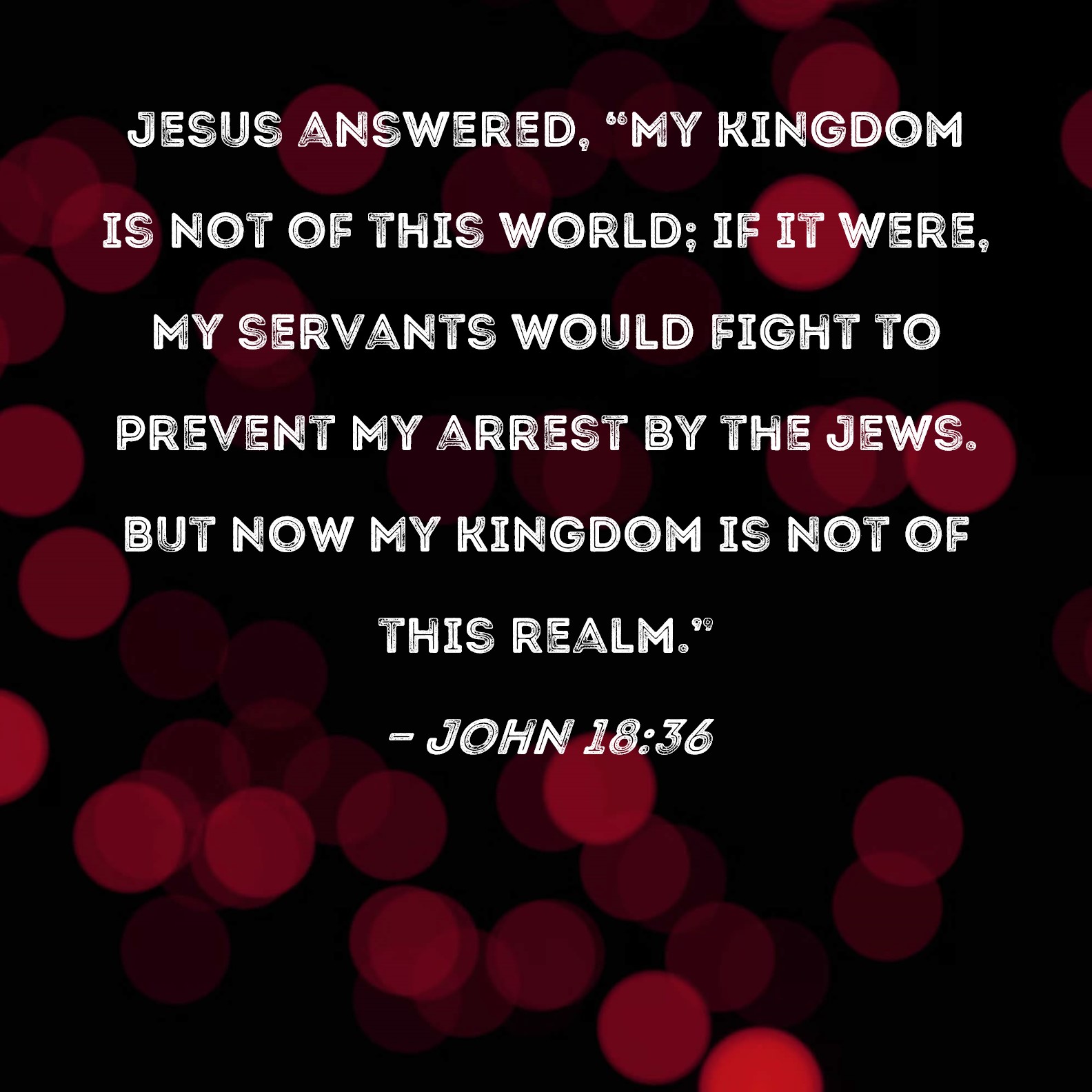 John 18:36 Jesus answered, "My kingdom is not of this world; if it were, My servants would fight to prevent My arrest by the Jews. But now My kingdom is not of this realm."