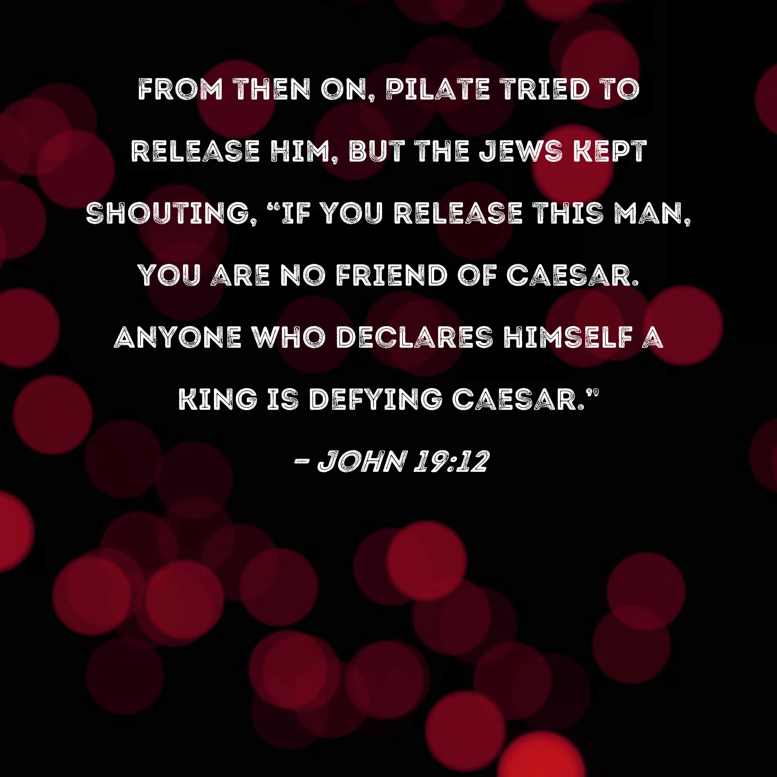 John 19:12 From then on, Pilate tried to release Him, but the Jews kept shouting, "If you release this man, you are no friend of Caesar. Anyone who declares himself a king is defying Caesar."