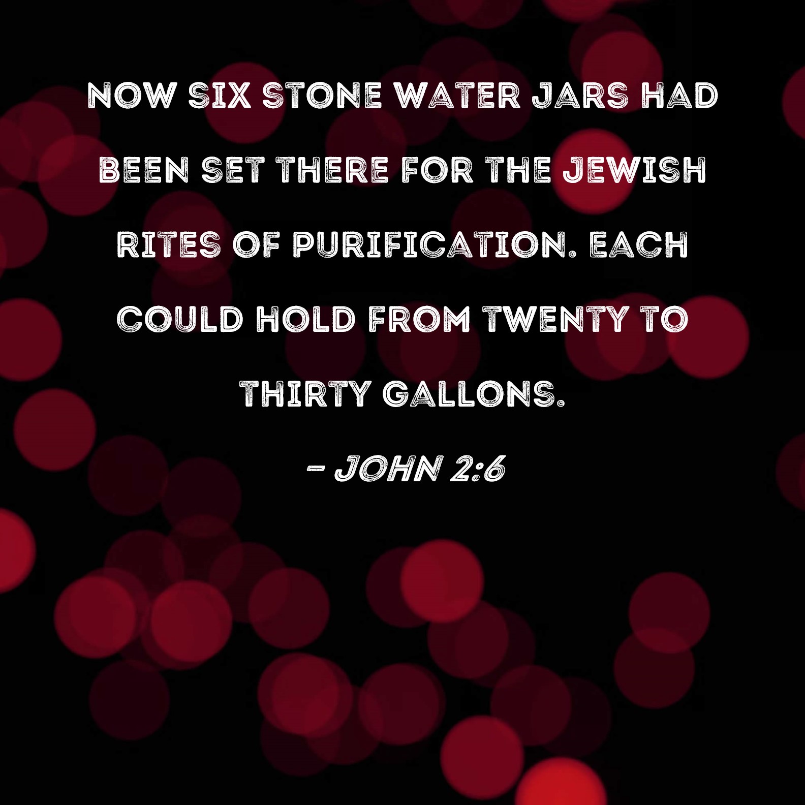 John 2:6 Now six stone water jars had been set there for the Jewish rites of purification. Each could hold from twenty to thirty gallons.