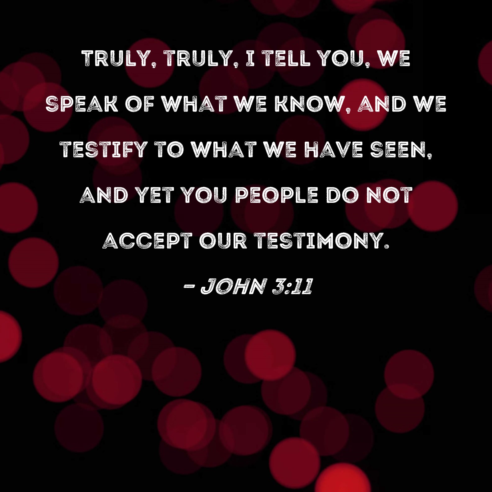 John 3:11 Truly, truly, I tell you, we speak of what we know, and we testify to what we have seen, and yet you people do not accept our testimony.
