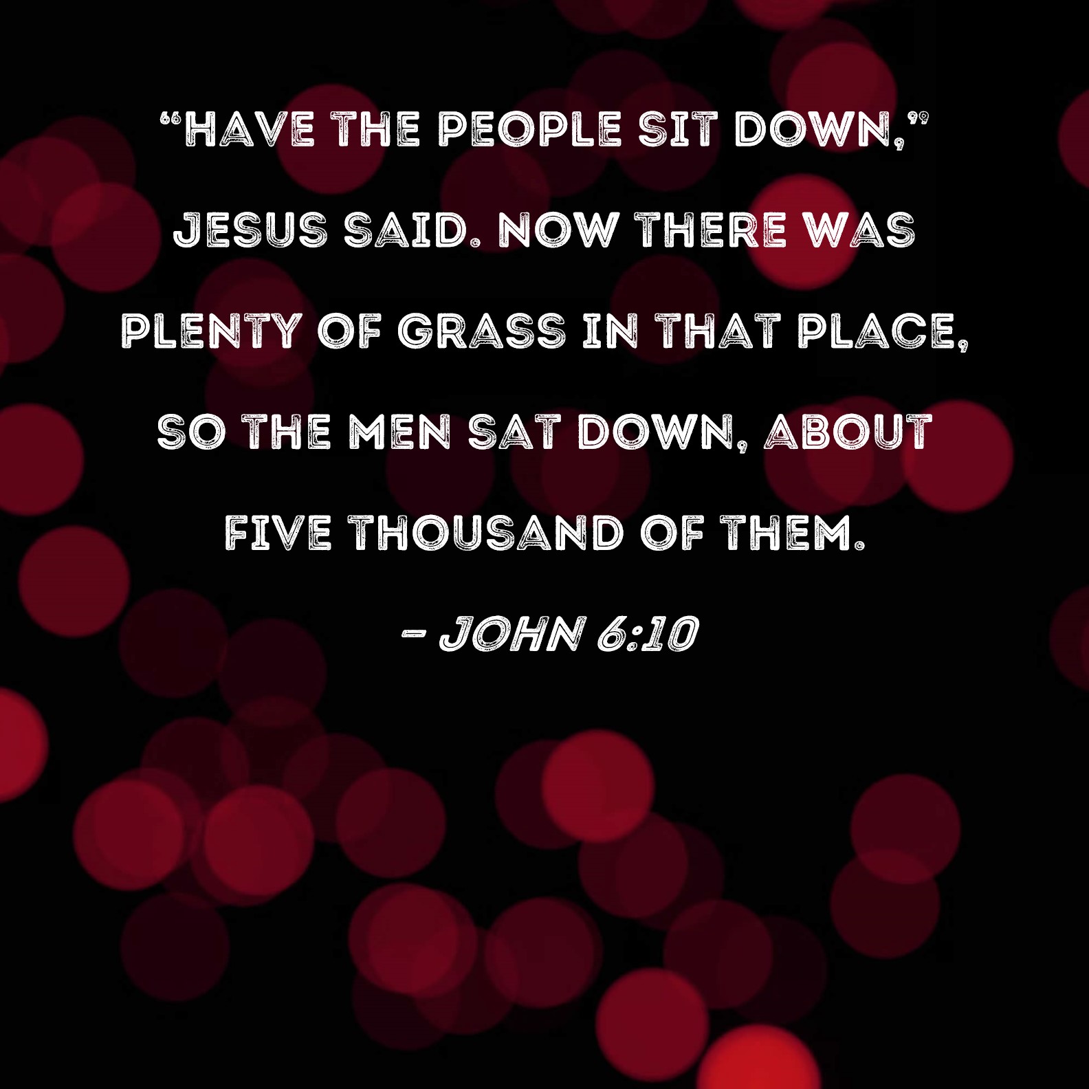 John 6:10 "Have the people sit down," Jesus said. Now there was plenty of grass in that place, so the men sat down, about five thousand of them.