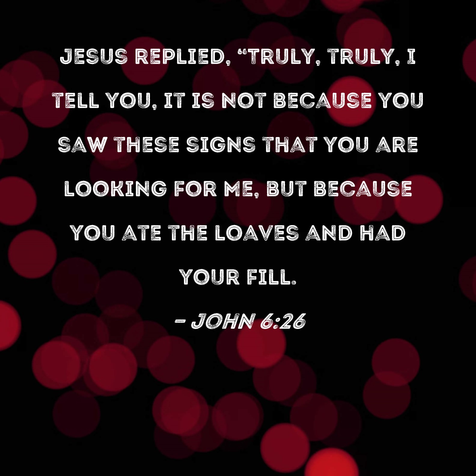 John 6:26 Jesus replied, "Truly, truly, I tell you, it is not because you saw these signs that you are looking for Me, but because you ate the loaves and had your fill.