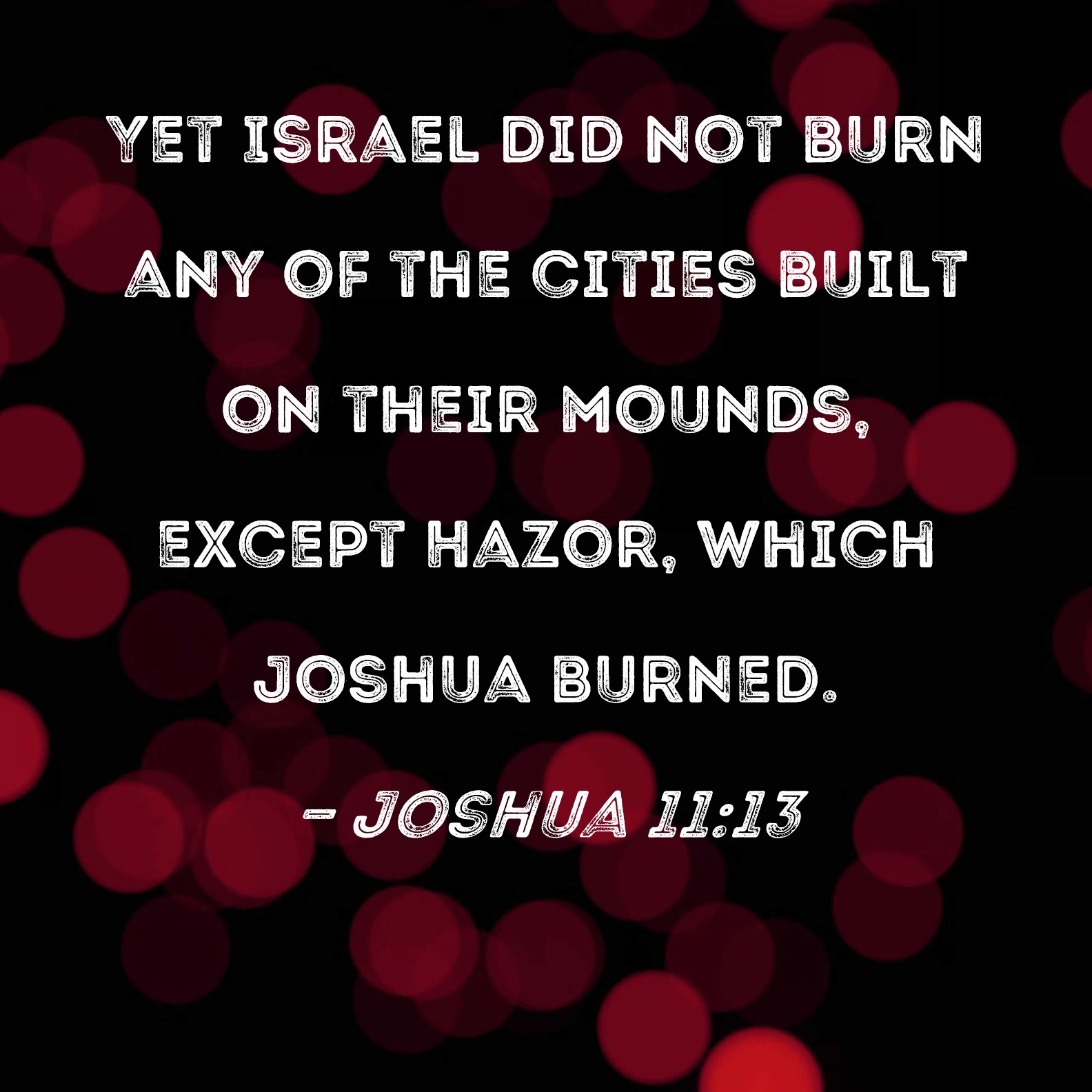 Joshua 11:13 Yet Israel did not burn any of the cities built on their mounds, except Hazor, which Joshua burned.