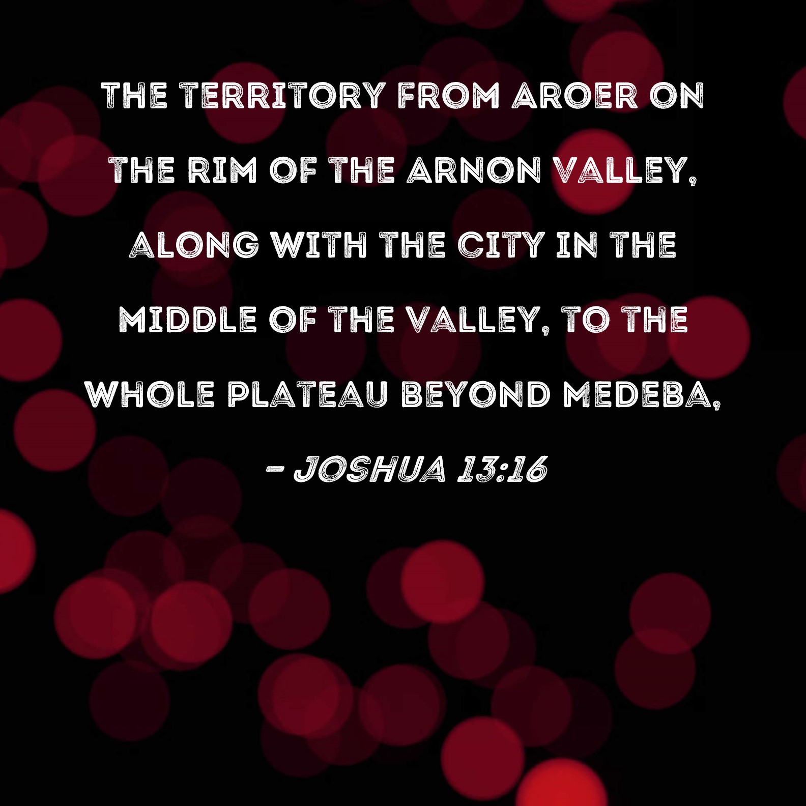 Joshua 13:16 The territory from Aroer on the rim of the Arnon Valley, along with the city in the middle of the valley, to the whole plateau beyond Medeba,