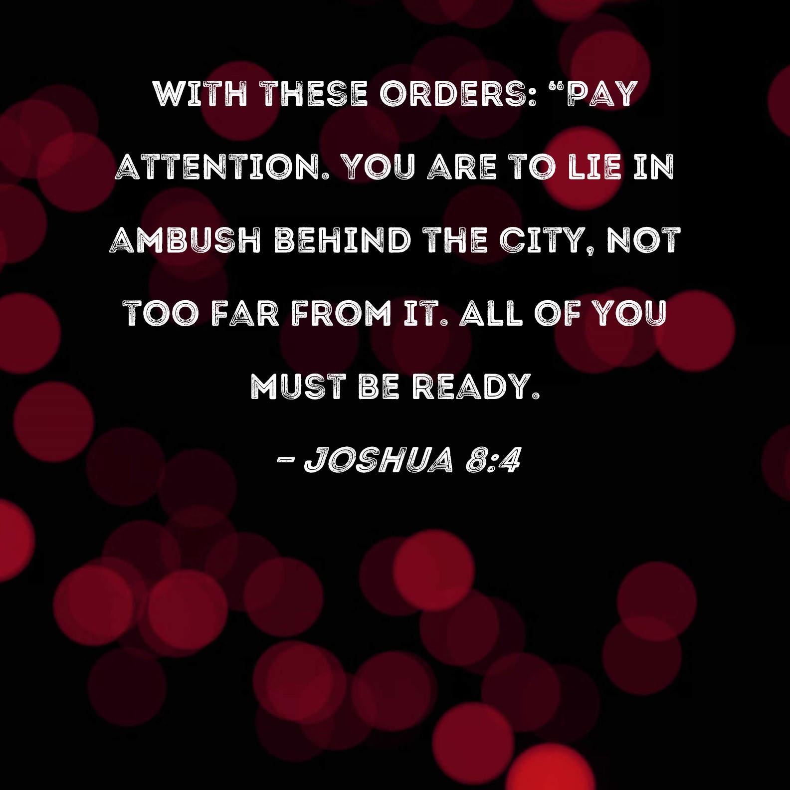 Joshua 8:4 with these orders: "Pay attention. You are to lie in ambush behind the city, not too far from it. All of you must be ready.