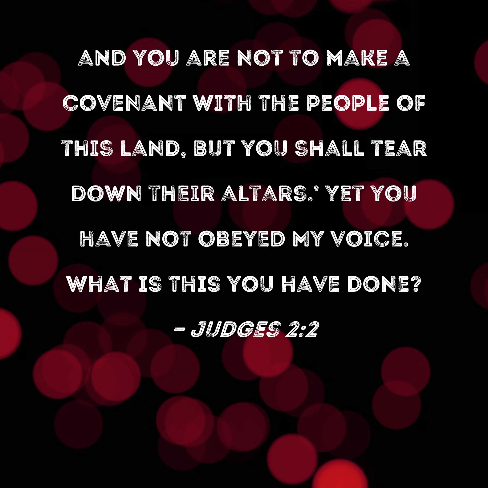 Judges 2:2 and you are not to make a covenant with the people of this land, but you shall tear down their altars.' Yet you have not obeyed My voice. What is this you have done?