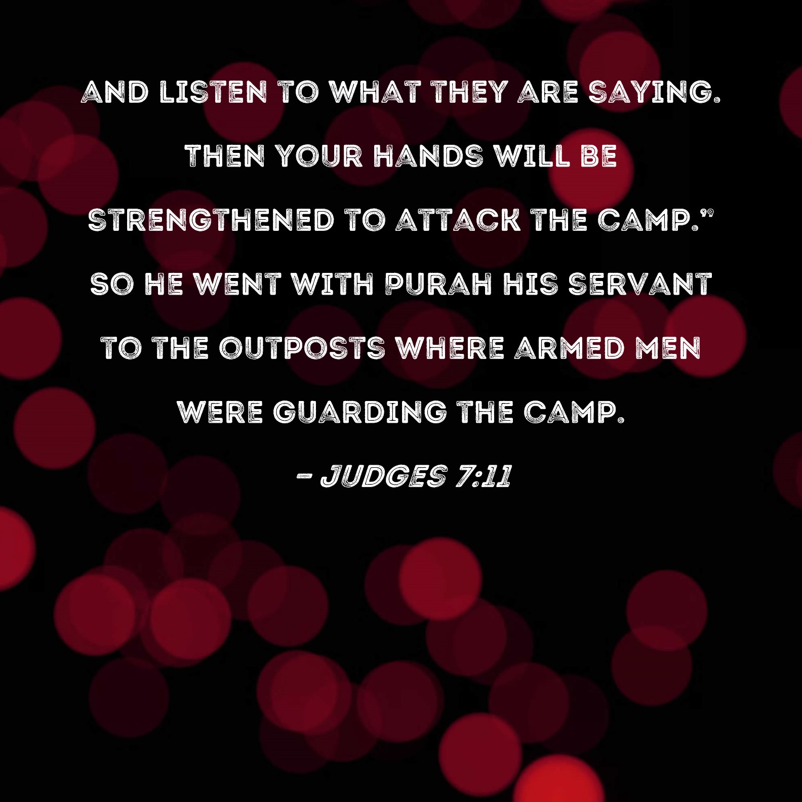 Judges 7:11 and listen to what they are saying. Then your hands will be strengthened to attack the camp." So he went with Purah his servant to the outposts where armed men were guarding the camp.