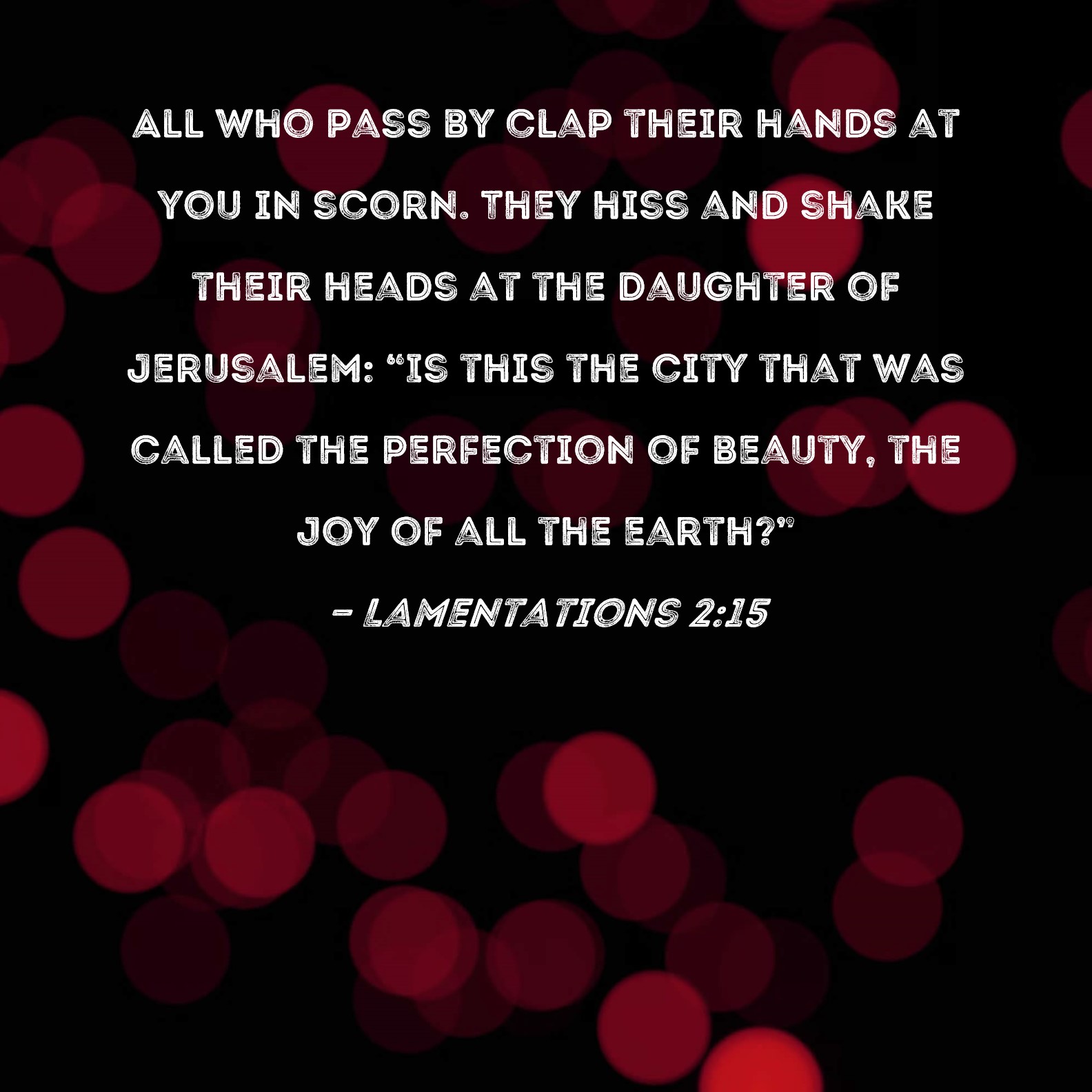 Lamentations 2:15 All who pass by clap their hands at you in scorn. They hiss and shake their heads at the Daughter of Jerusalem: "Is this the city that was called the perfection of beauty, the joy of all the earth?"