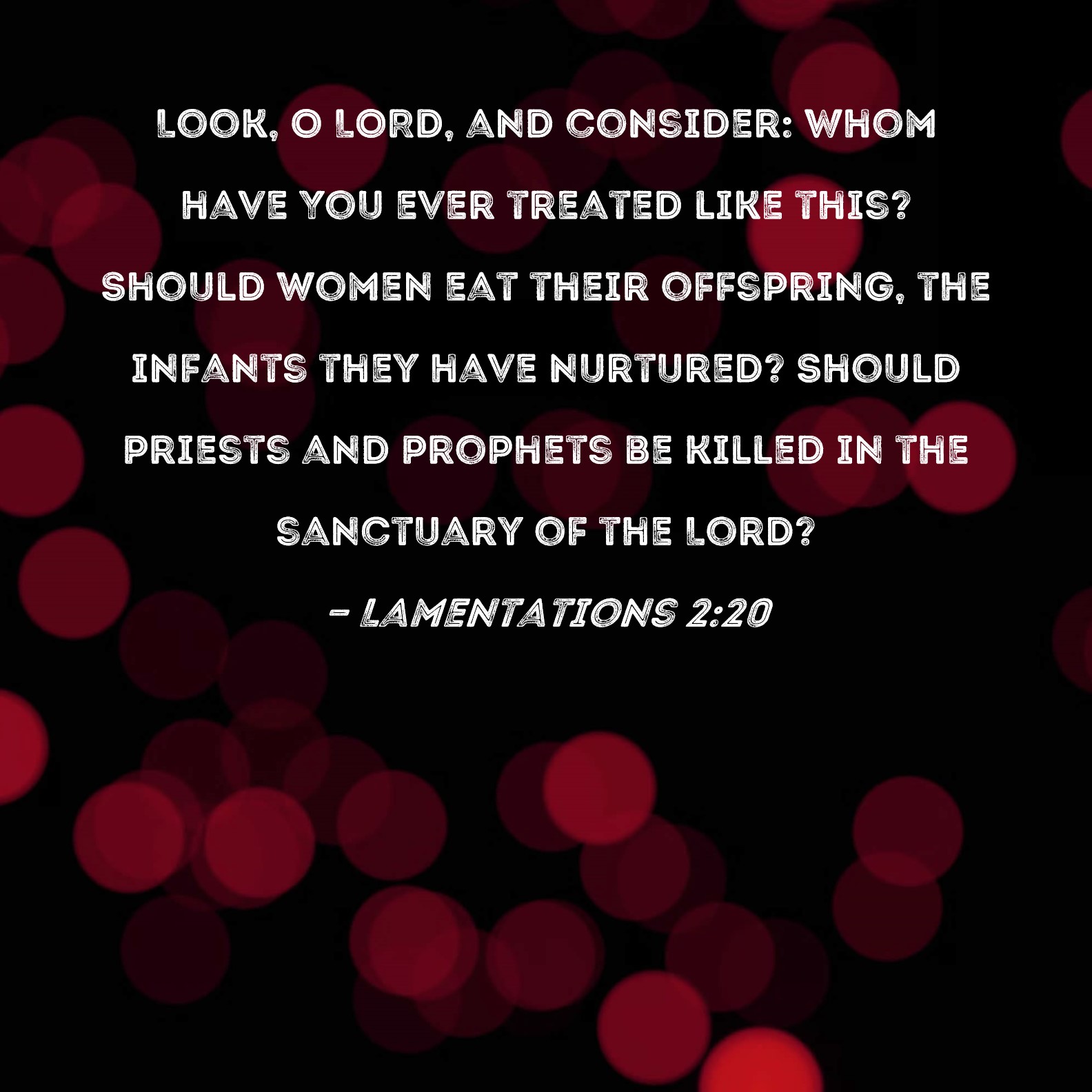 BSB:  Look, O LORD, and consider: Whom have You ever treated like this? Should women eat their offspring, the infants they have nurtured? Should priests and prophets be killed in the sanctuary of the Lord?