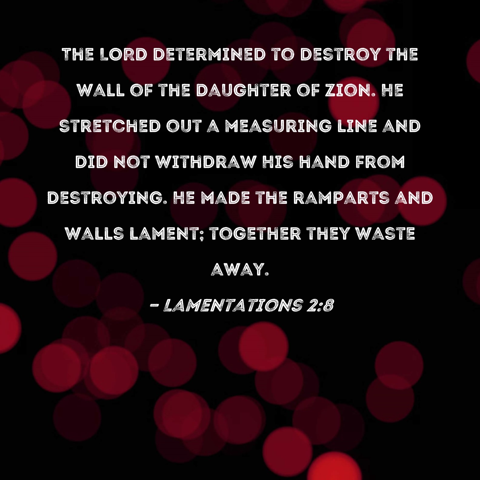 Lamentations 2:8 The LORD determined to destroy the wall of the Daughter of Zion. He stretched out a measuring line and did not withdraw His hand from destroying. He made the ramparts and walls lament; together they waste away.