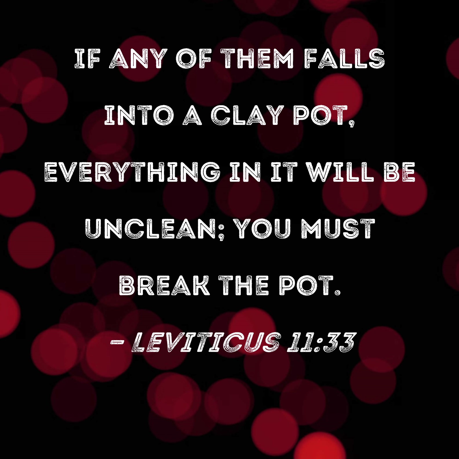 Leviticus 11:33 If any of them falls into a clay pot, everything in it will be unclean; you must break the pot.