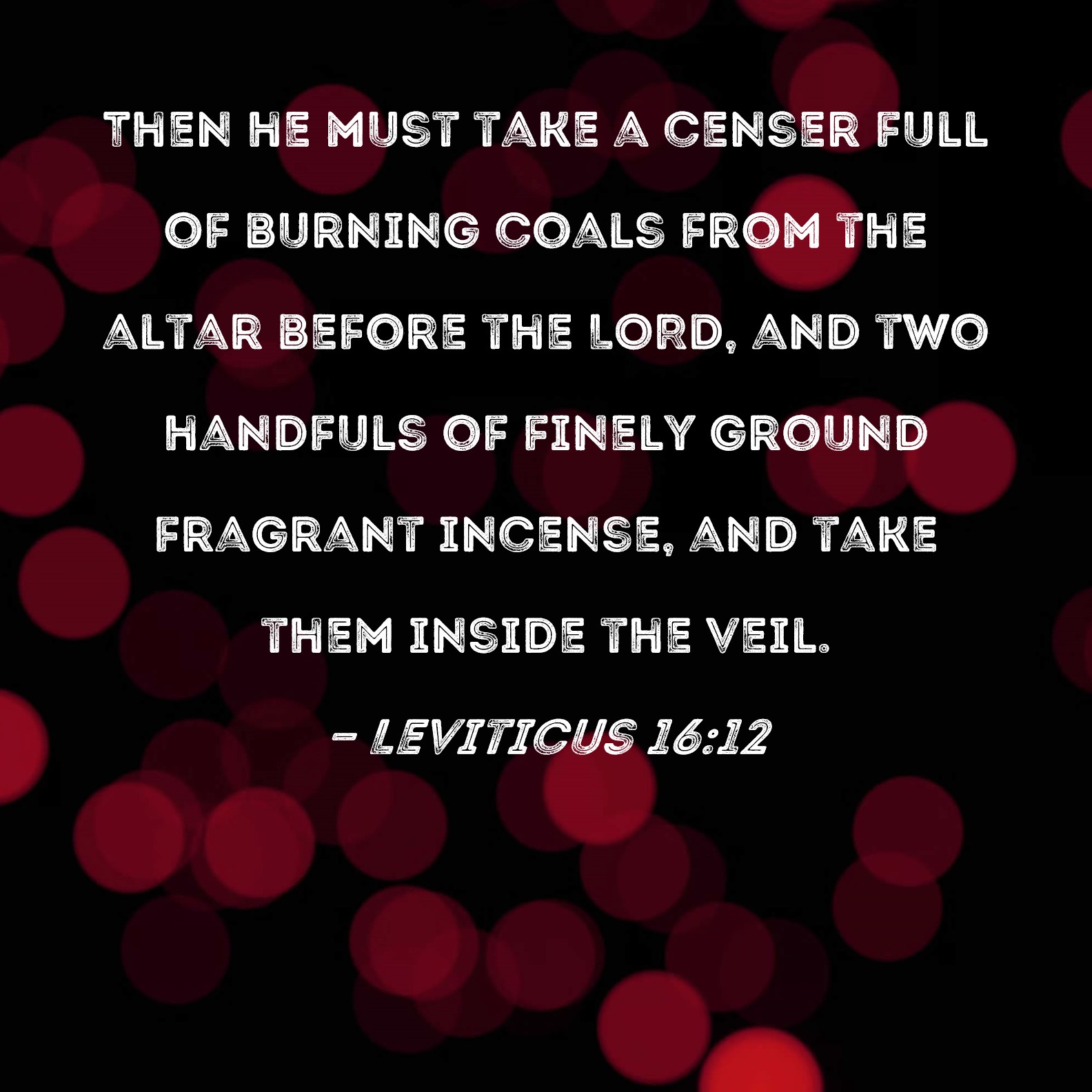 Leviticus 16:12 Then he must take a censer full of burning coals from the altar before the LORD, and two handfuls of finely ground fragrant incense, and take them inside the veil.