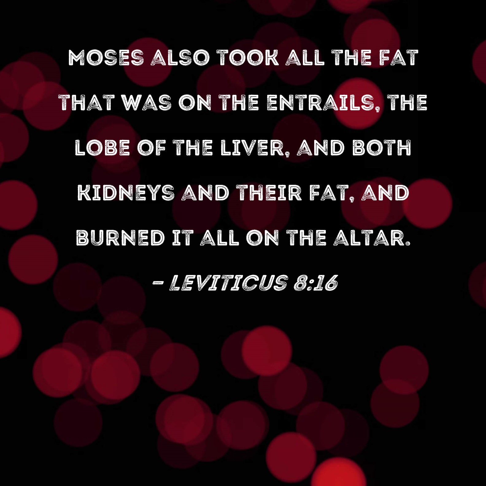 Leviticus 8:16 Moses also took all the fat that was on the entrails, the lobe of the liver, and both kidneys and their fat, and burned it all on the altar.