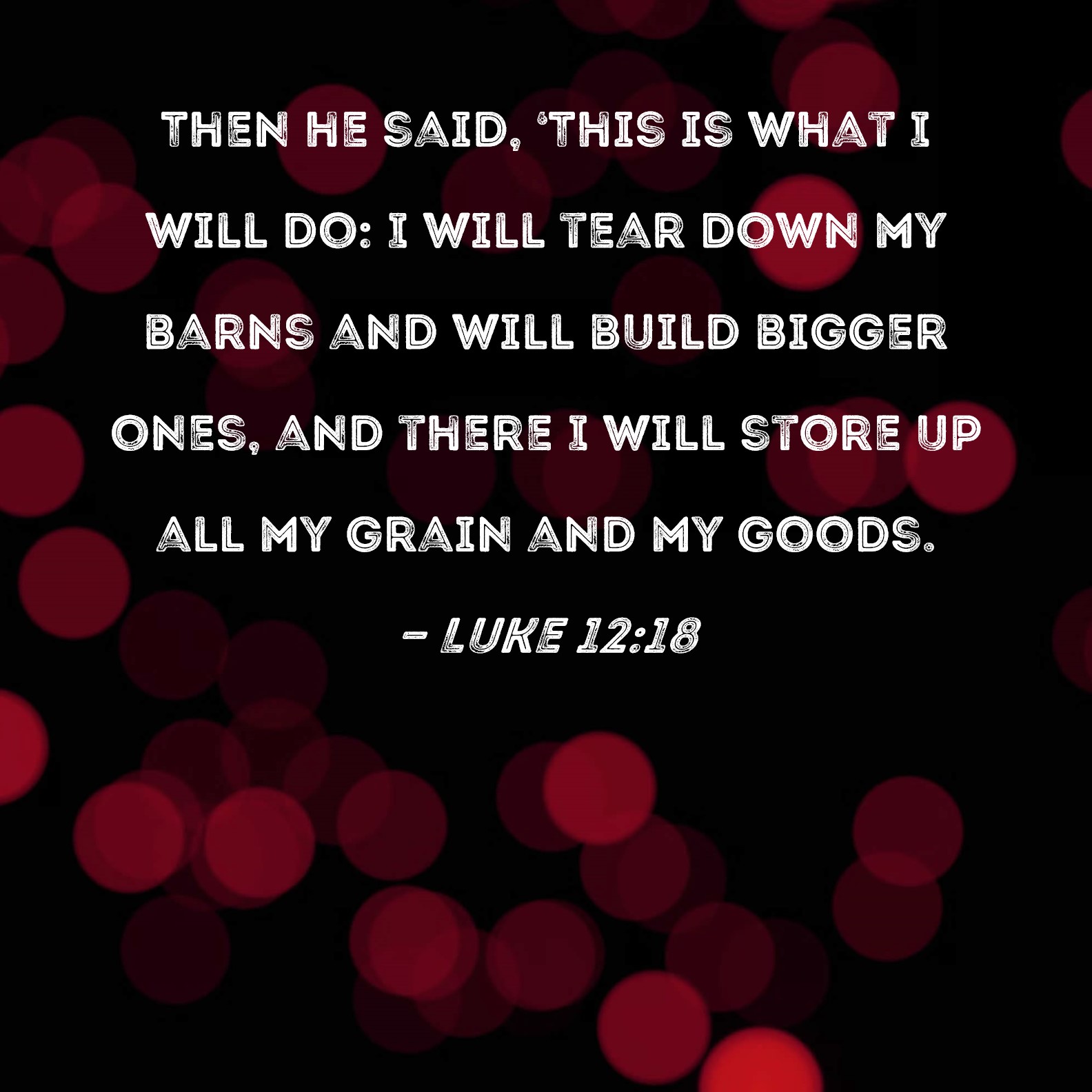 Luke 12:18 Then he said, 'This is what I will do: I will tear down my barns and will build bigger ones, and there I will store up all my grain and my goods.