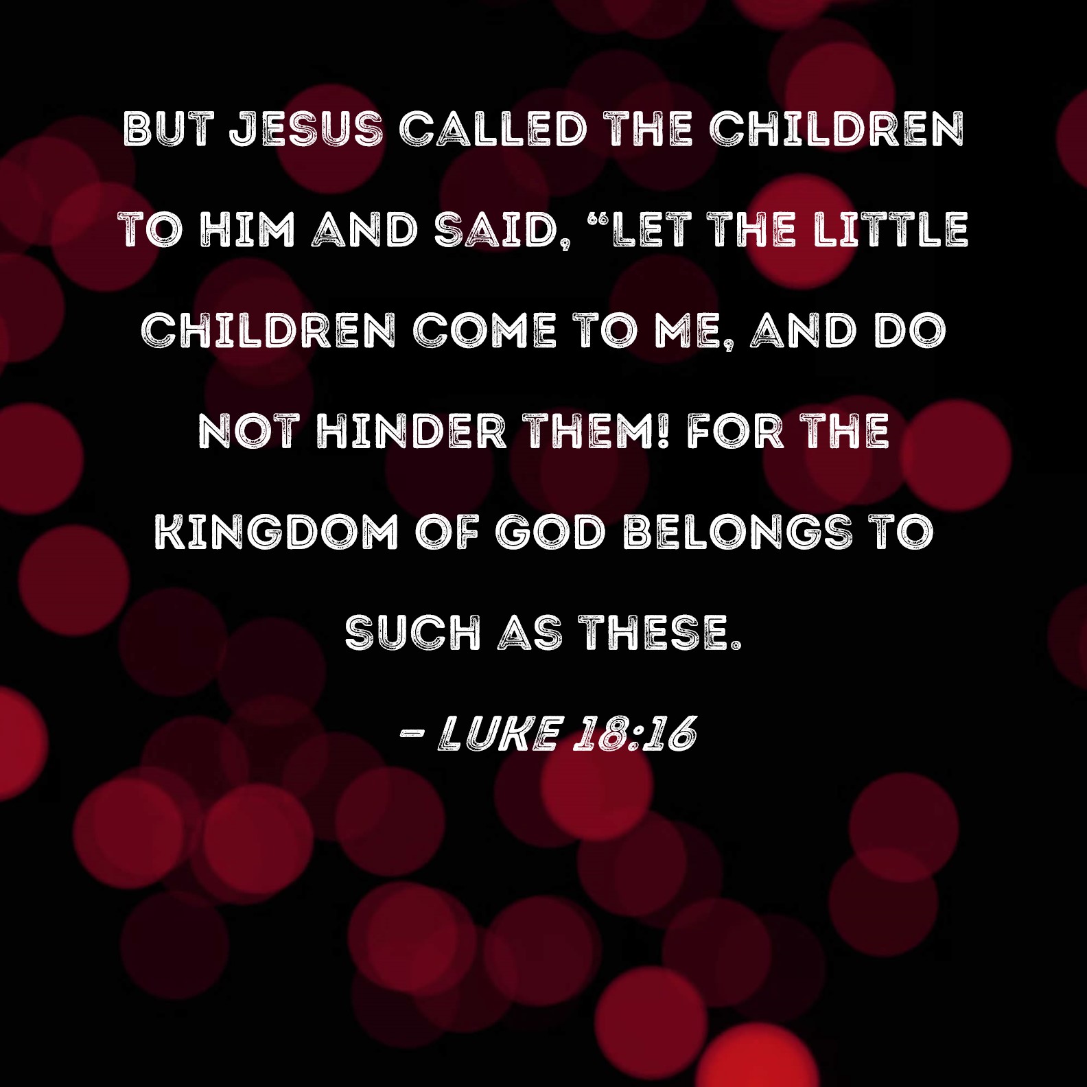 Luke 18:16 But Jesus called the children to Him and said, "Let the little children come to Me, and do not hinder them! For the kingdom of God belongs to such as these.