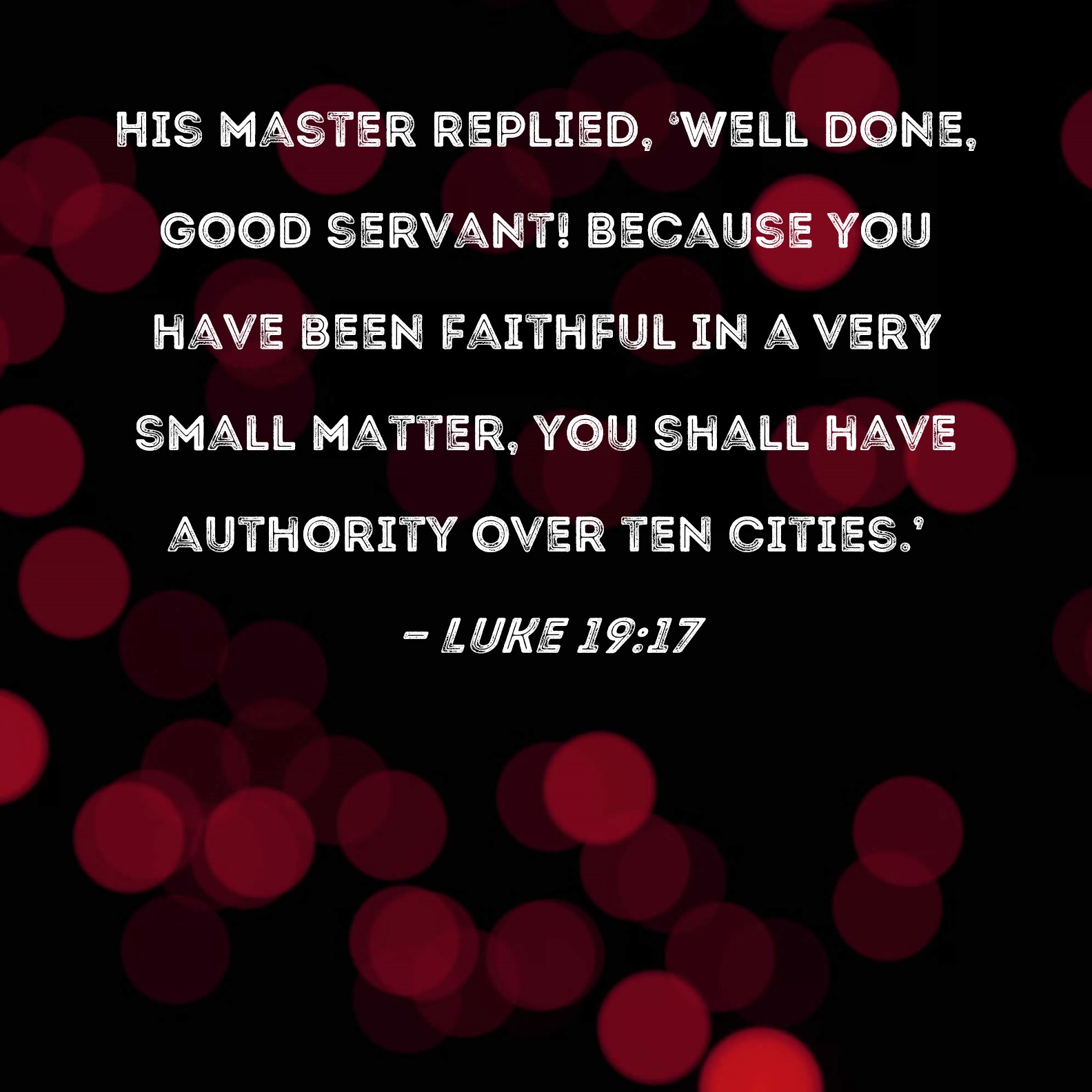 Luke 19:17 His master replied, 'Well done, good servant! Because you have been faithful in a very small matter, you shall have authority over ten cities.'