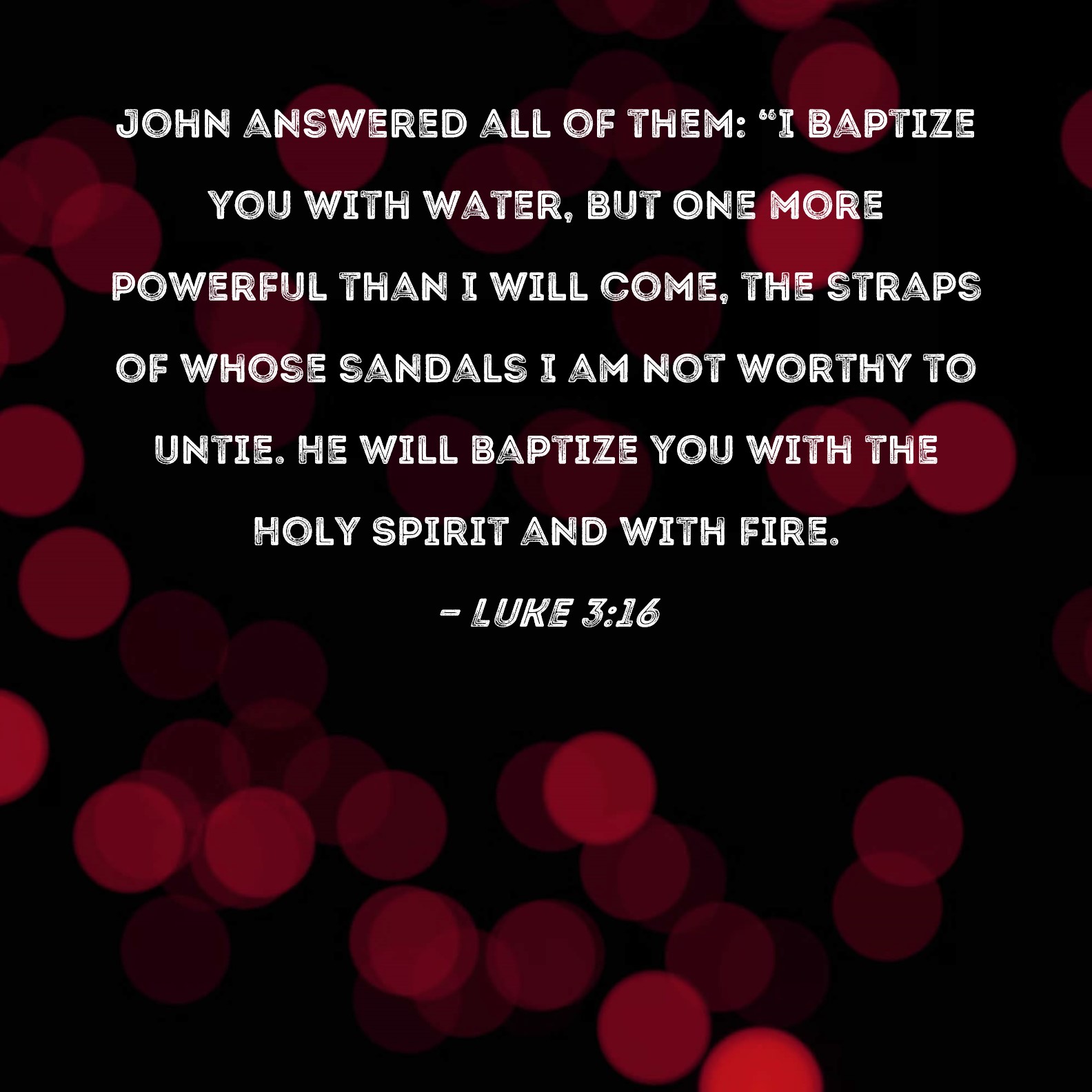 Luke 3:16 John answered all of them: "I baptize you with water, but One more powerful than I will come, the straps of whose sandals I am not worthy to untie. He will baptize you with the Holy Spirit and with fire.