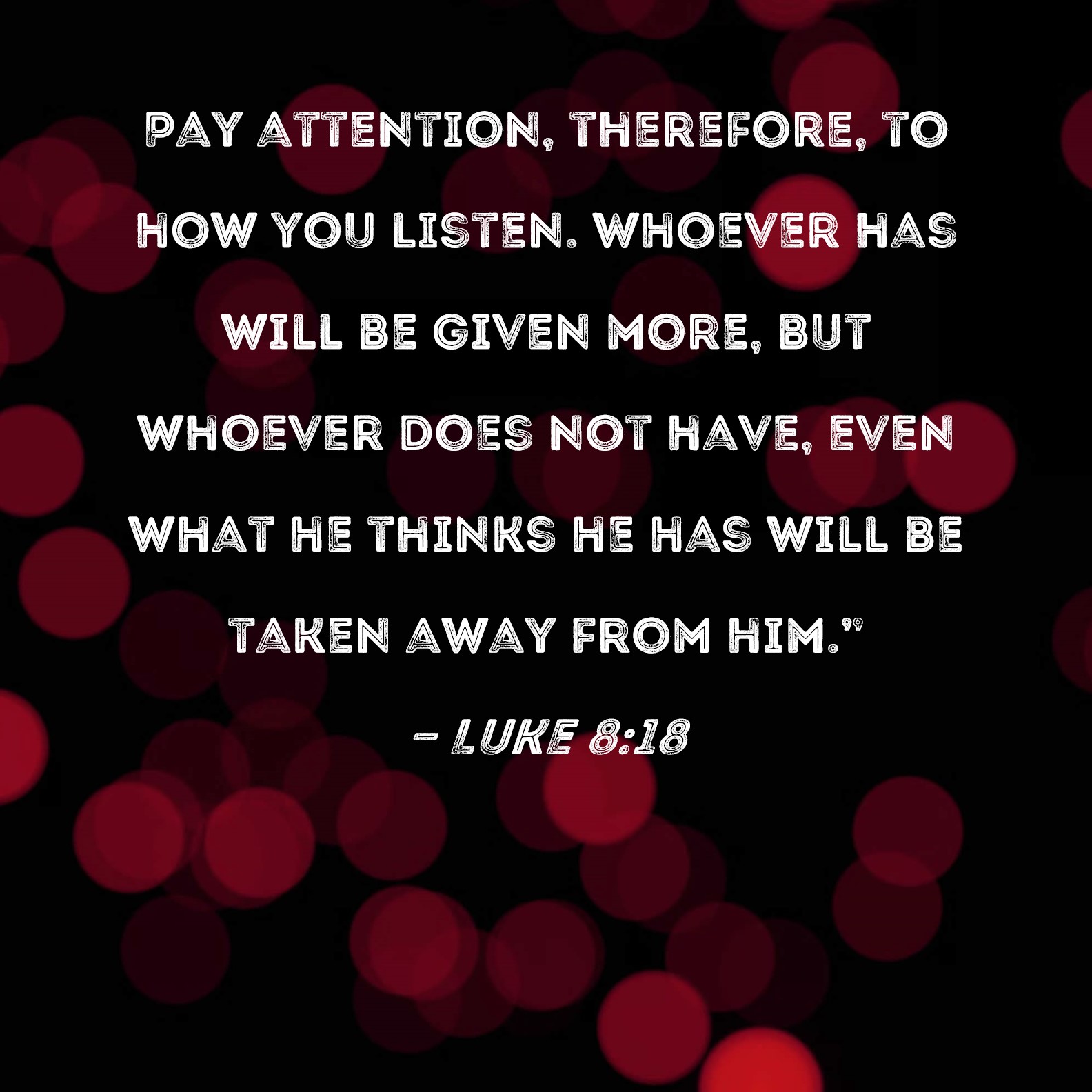 Luke 8:18 Pay attention, therefore, to how you listen. Whoever has will be given more, but whoever does not have, even what he thinks he has will be taken away from him."
