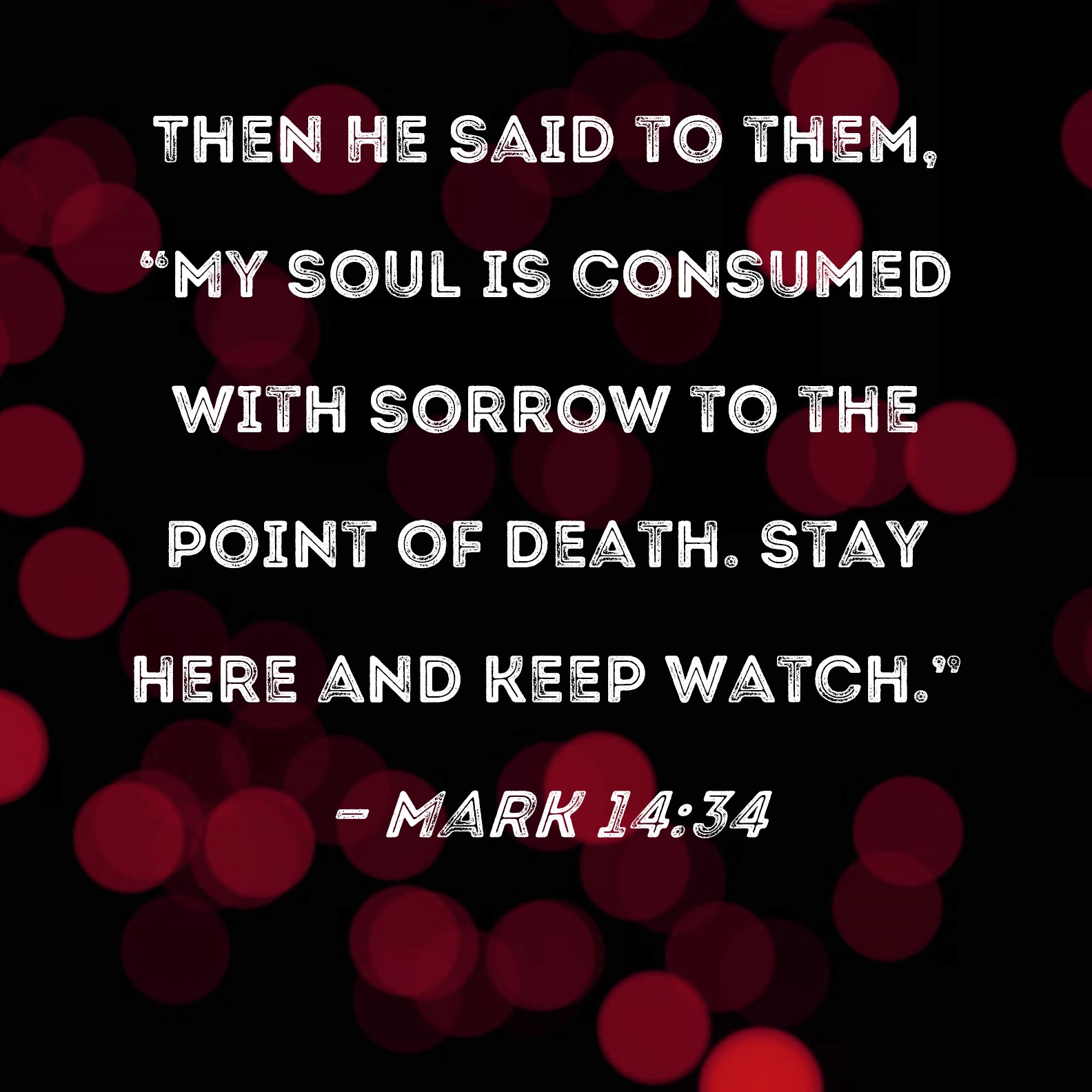 Mark 14:34 Then He said to them, "My soul is consumed with sorrow to the point of death. Stay here and keep watch."