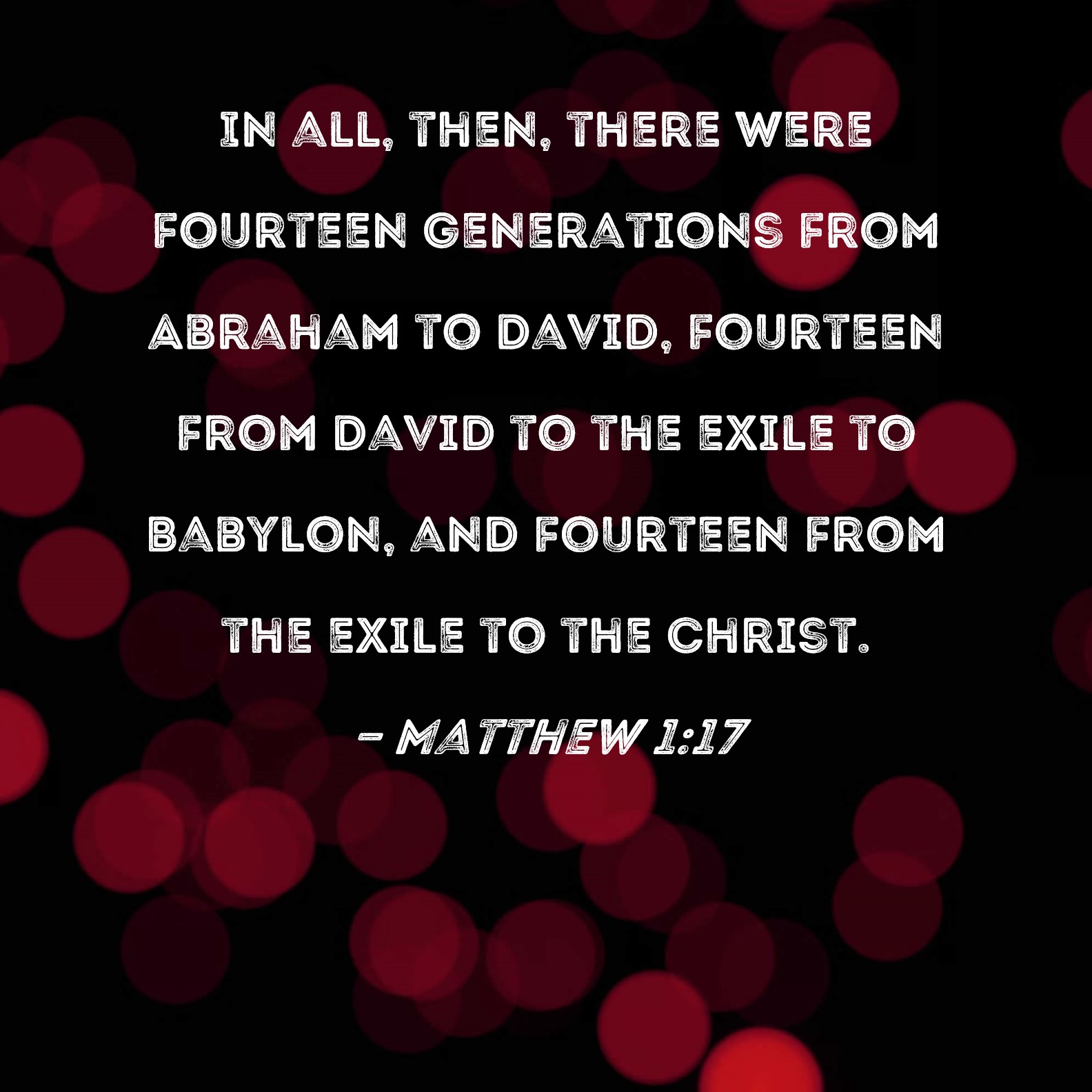 Matthew 1:17 In all, then, there were fourteen generations from Abraham to David, fourteen from David to the exile to Babylon, and fourteen from the exile to the Christ.
