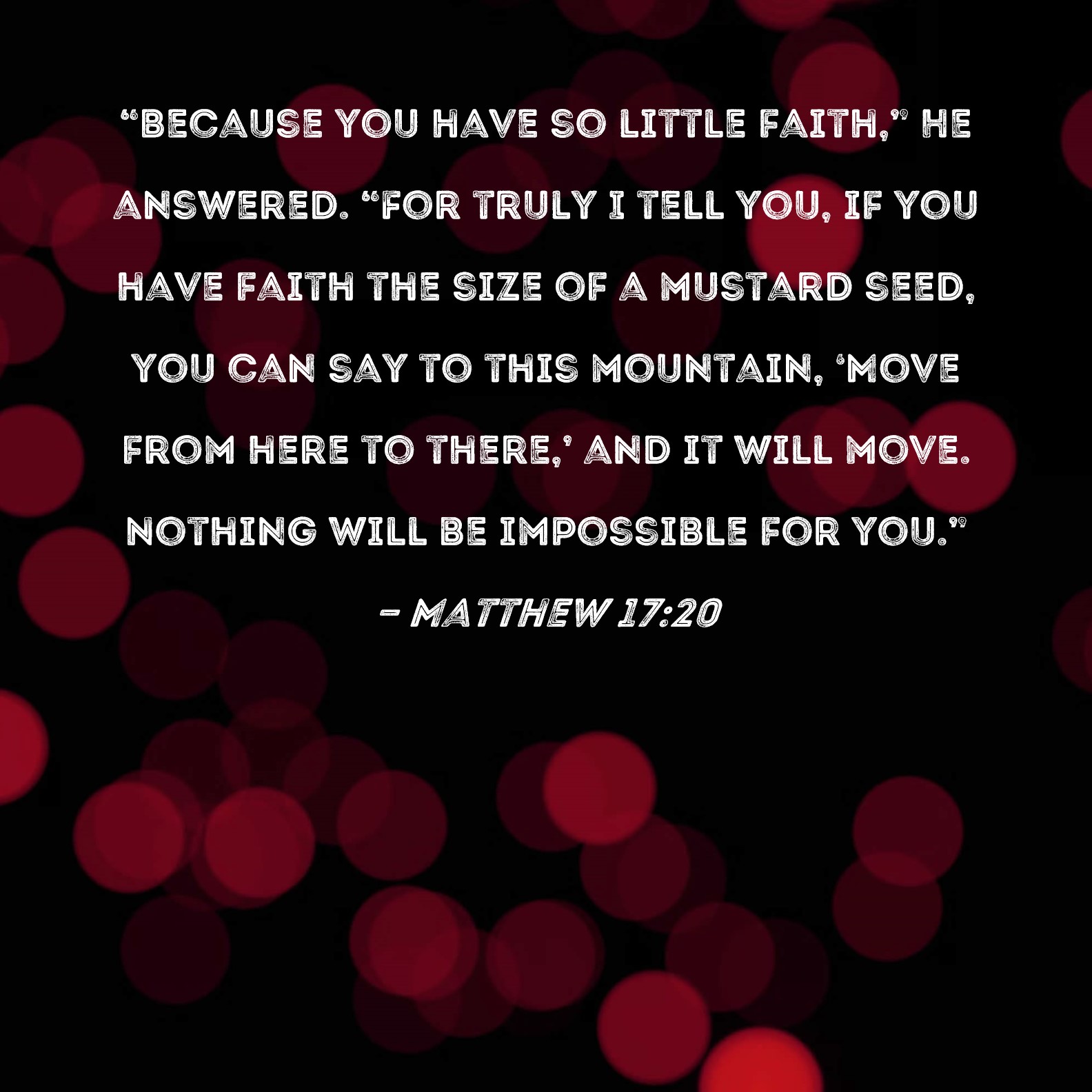 Matthew 17:20 "Because you have so little faith," He answered. "For truly I tell you, if you have faith the size of a mustard seed, you can say to this mountain, 'Move from here to there,' and it will move. Nothing will be impossible for you."