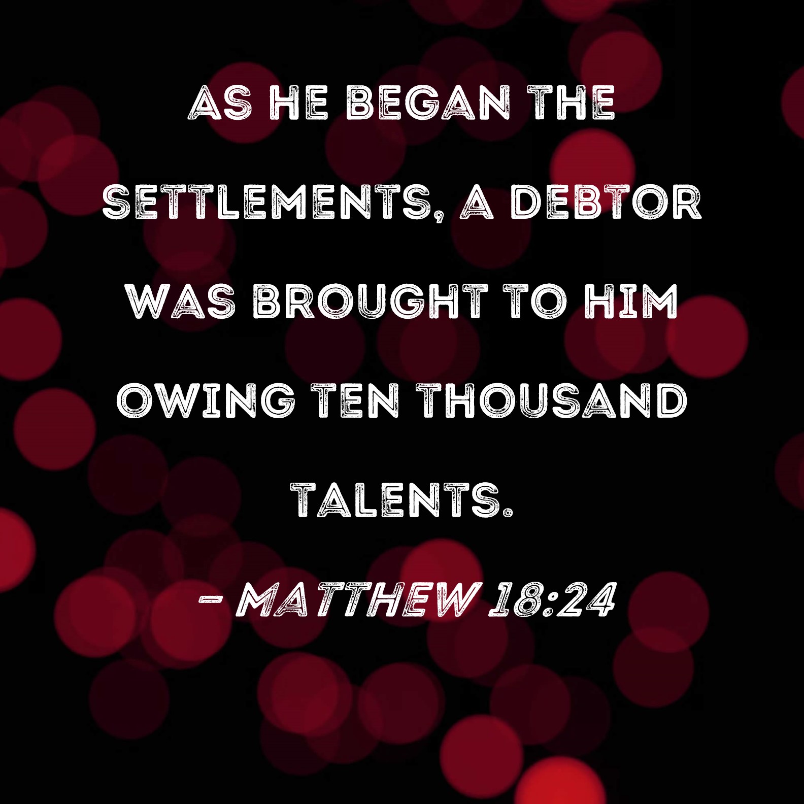 Matthew 18:24 As he began the settlements, a debtor was brought to him owing ten thousand talents.