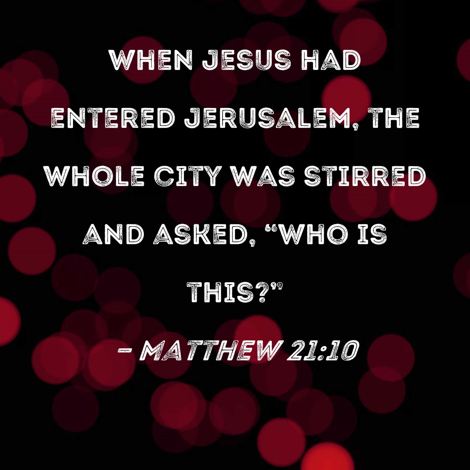 Matthew 21:10 When Jesus had entered Jerusalem, the whole city was stirred and asked, "Who is this?"