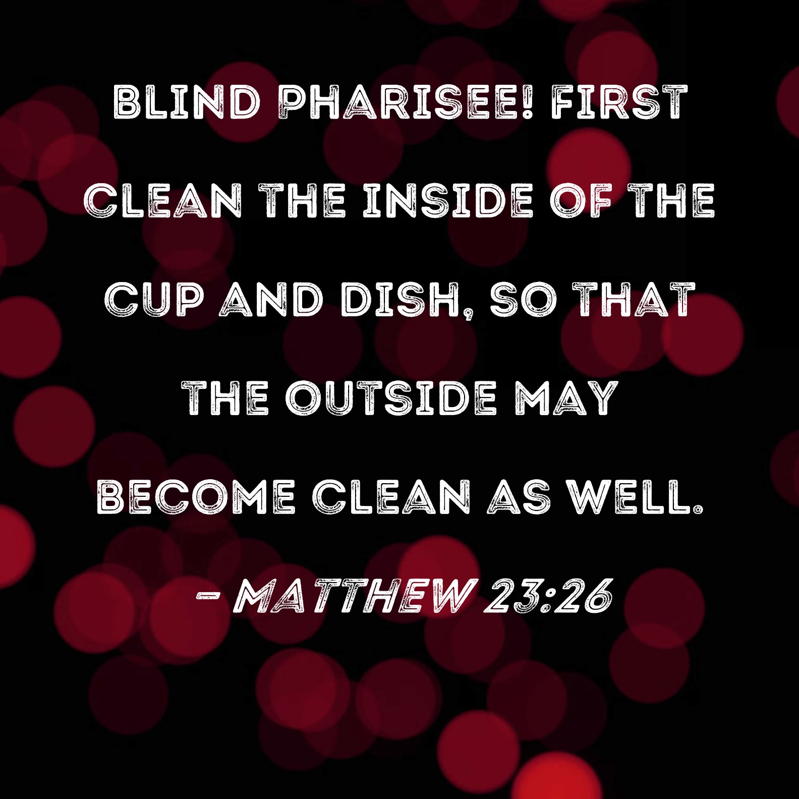 Matthew 23:26 Blind Pharisee! First clean the inside of the cup and dish, so that the outside may become clean as well.