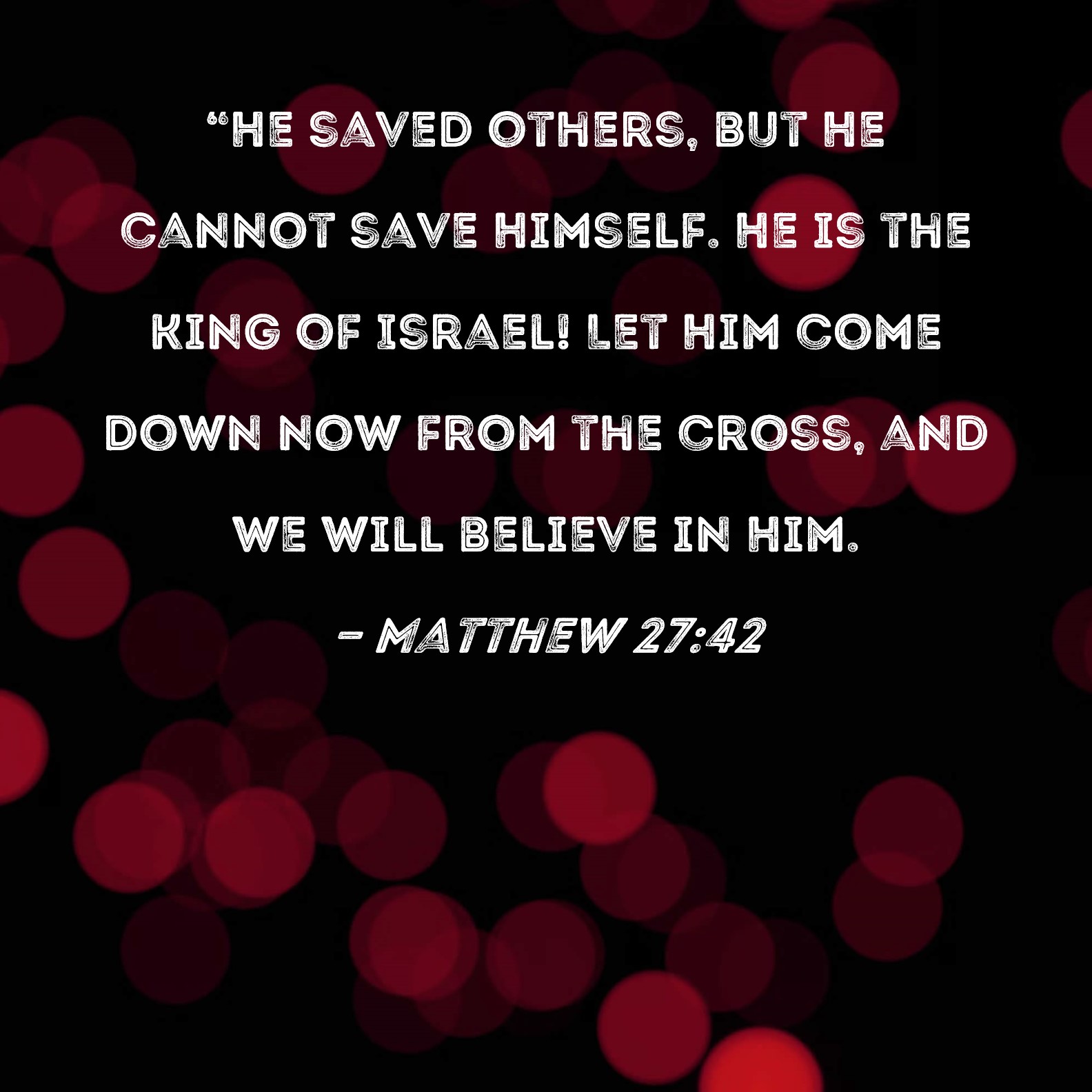 Matthew 27:42 "He saved others, but He cannot save Himself. He is the King of Israel! Let Him come down now from the cross, and we will believe in Him.