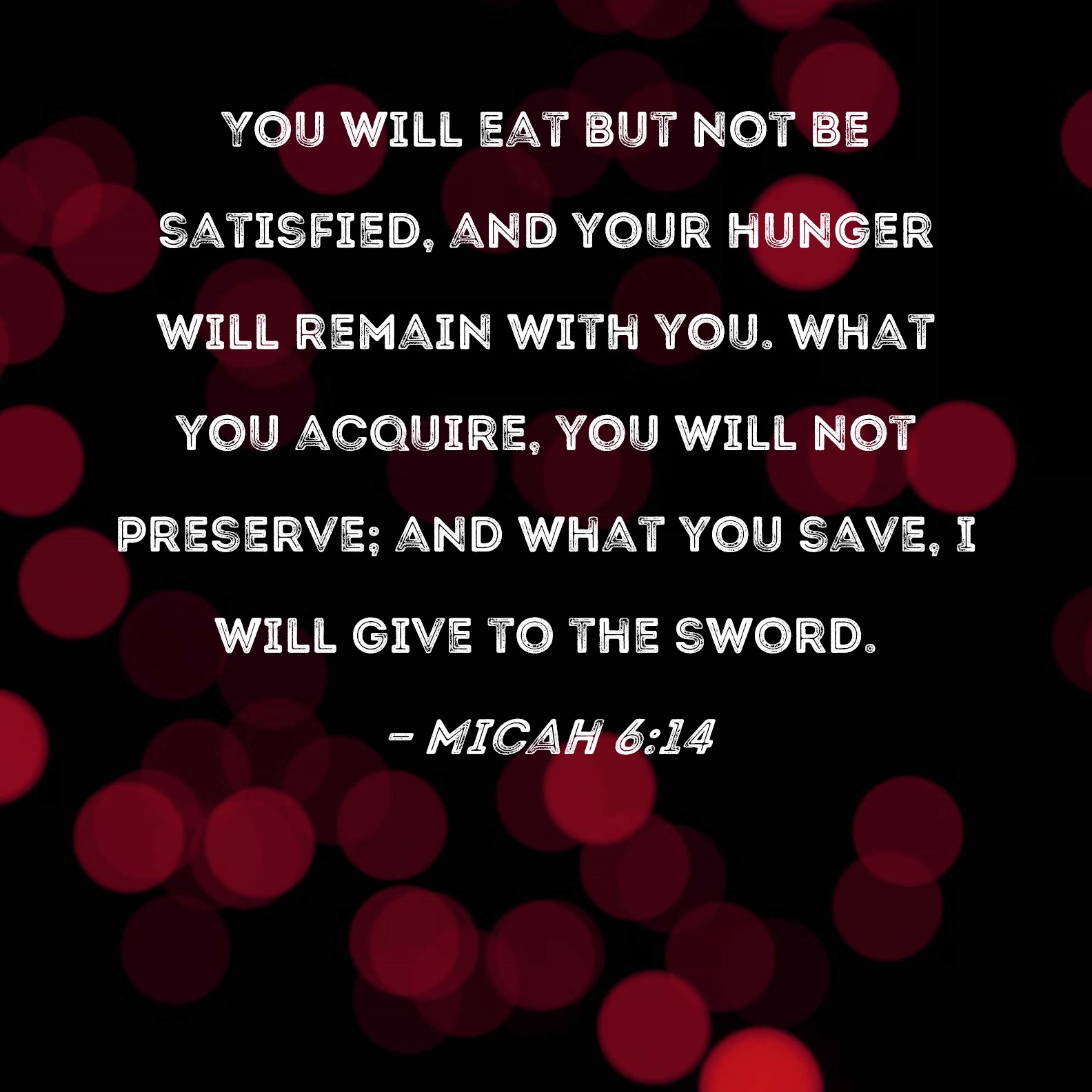 Micah 6:14 You will eat but not be satisfied, and your hunger will remain with you. What you acquire, you will not preserve; and what you save, I will give to the sword.