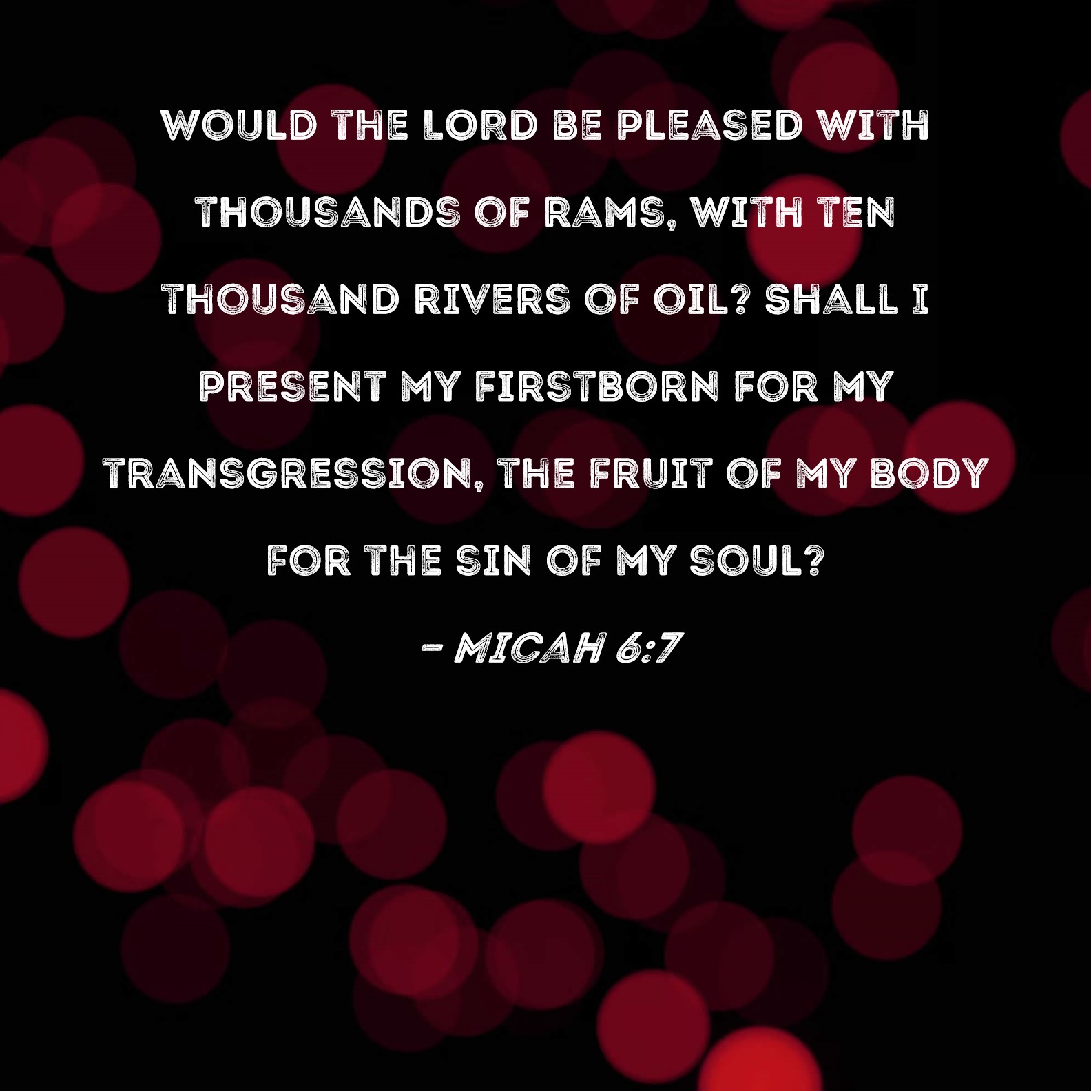 Micah 6:7 Would the LORD be pleased with thousands of rams, with ten thousand rivers of oil? Shall I present my firstborn for my transgression, the fruit of my body for the sin of my soul?