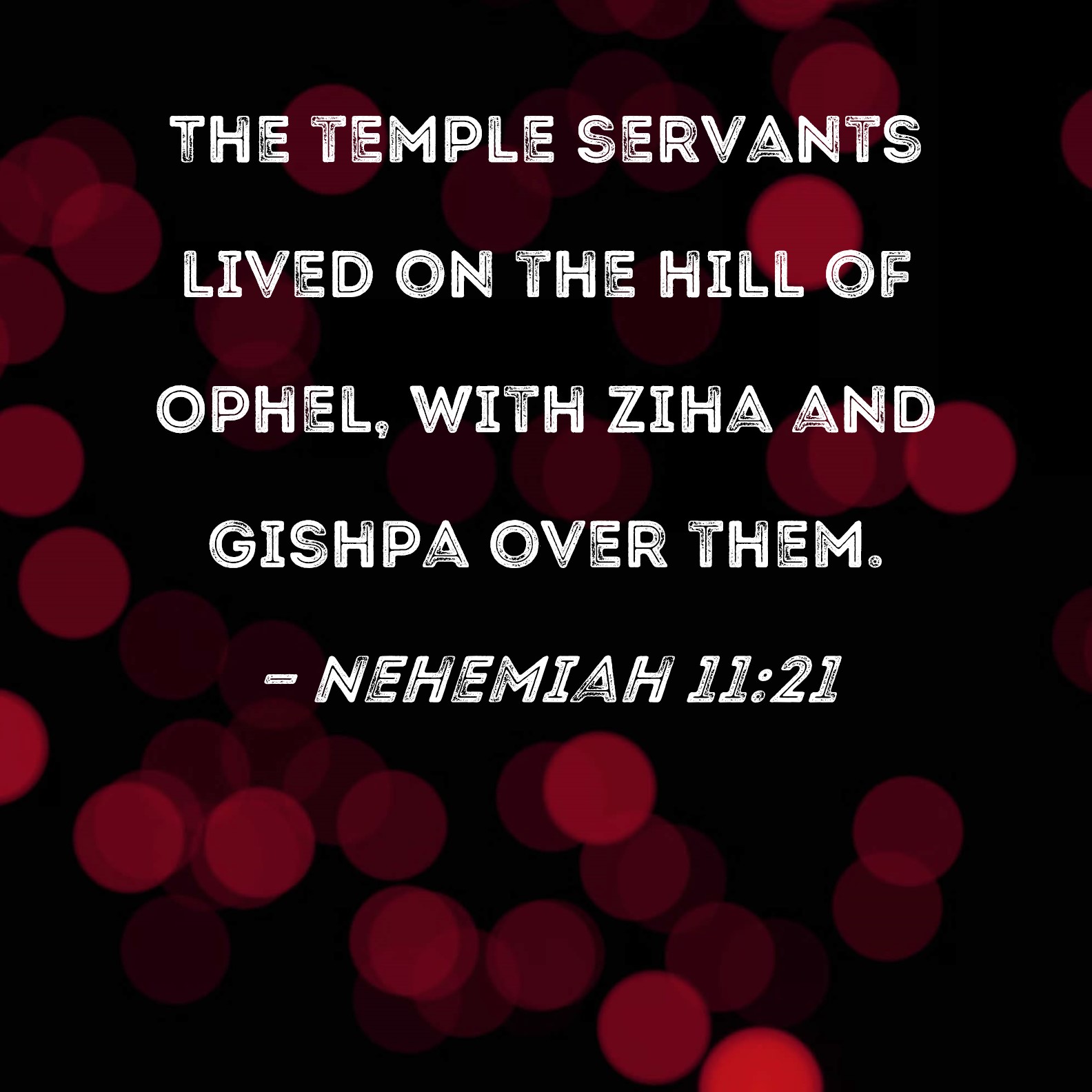 Nehemiah 11:21 The temple servants lived on the hill of Ophel, with Ziha and Gishpa over them.