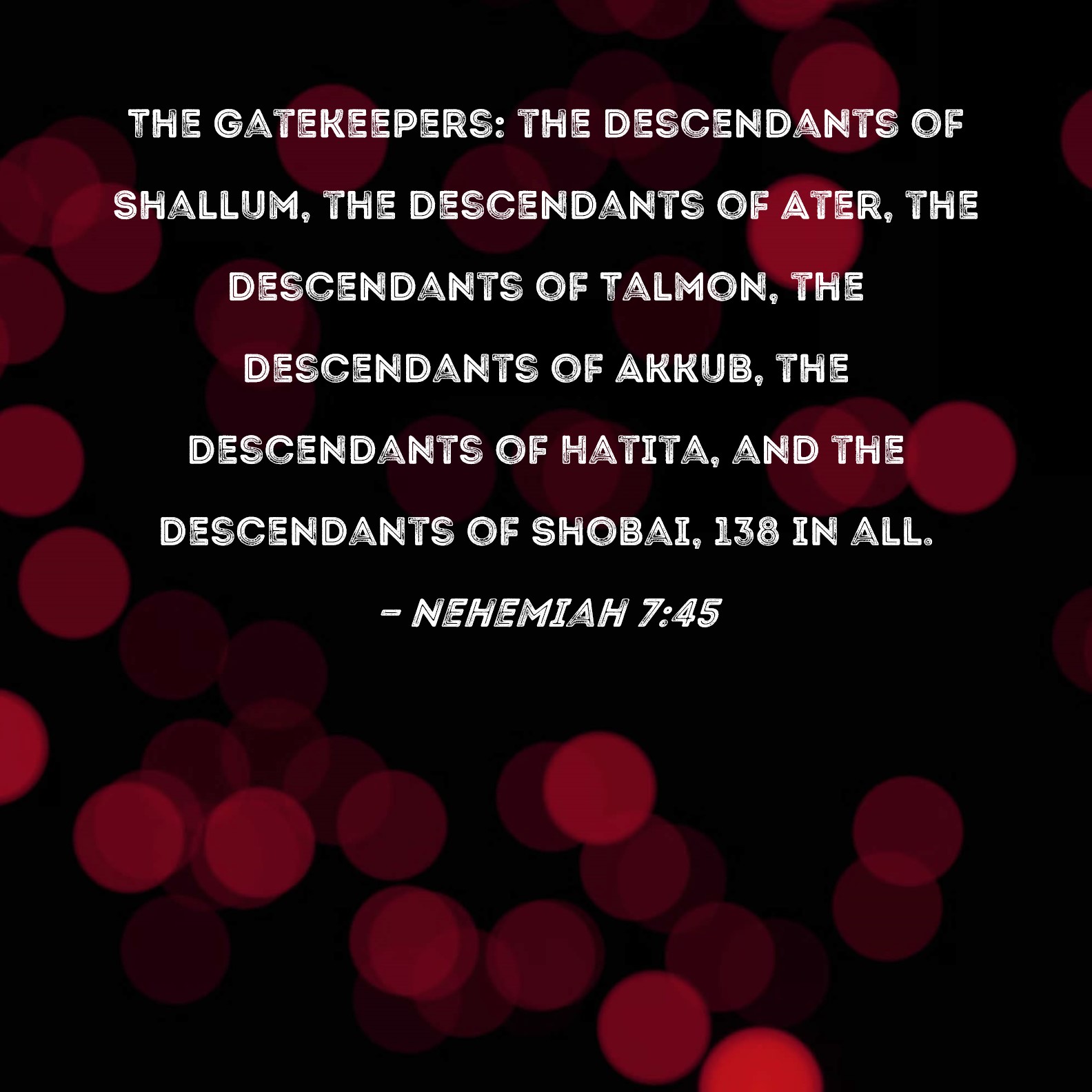 Nehemiah 7:45 The gatekeepers: the descendants of Shallum, the descendants of Ater, the descendants of Talmon, the descendants of Akkub, the descendants of Hatita, and the descendants of Shobai, 138 in all.