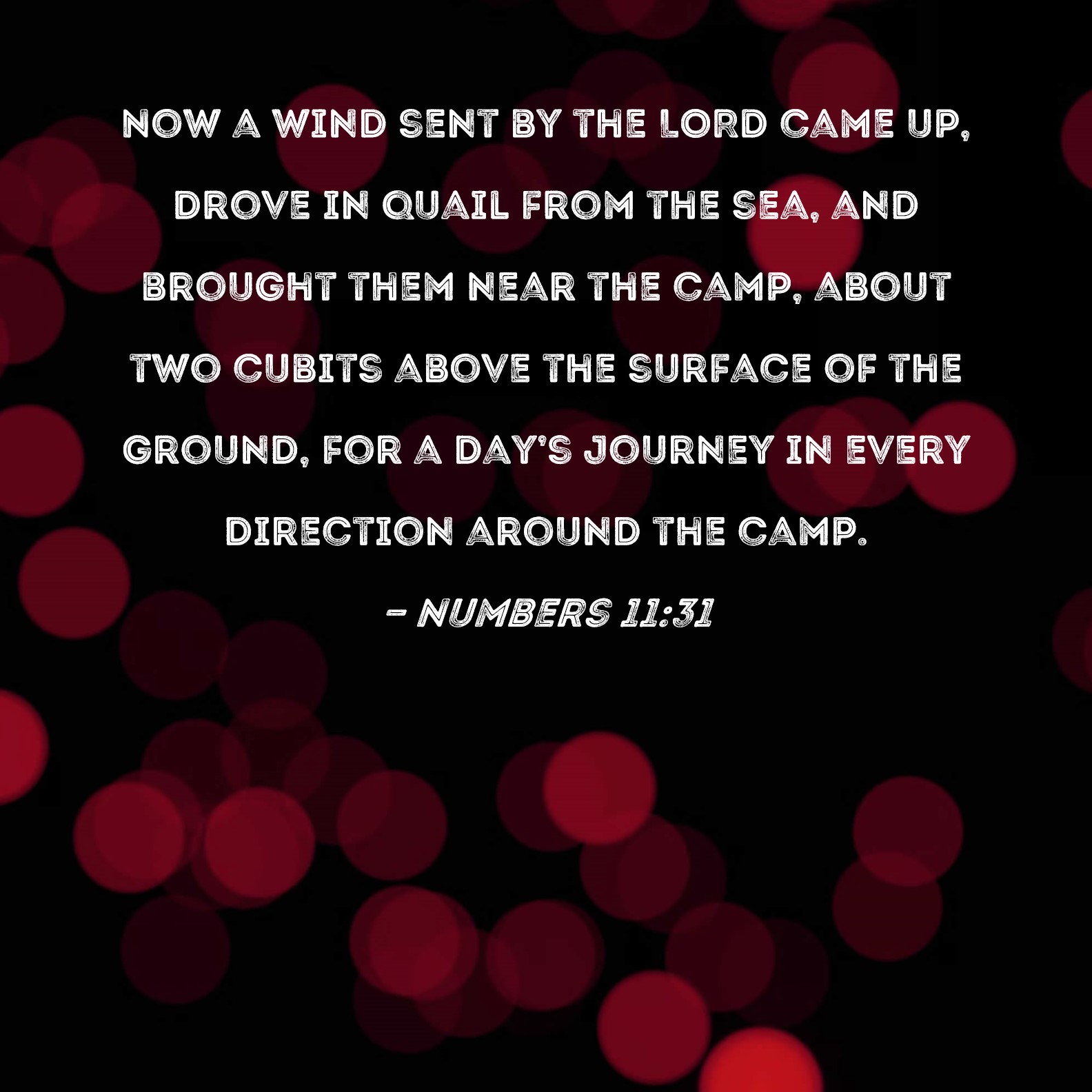Numbers 11:31 Now a wind sent by the LORD came up, drove in quail from the sea, and brought them near the camp, about two cubits above the surface of the ground, for a day's journey in every direction around the camp.